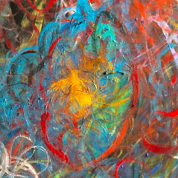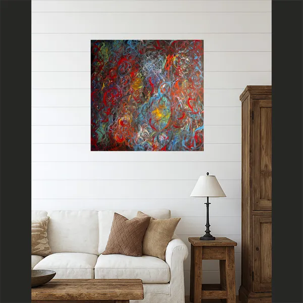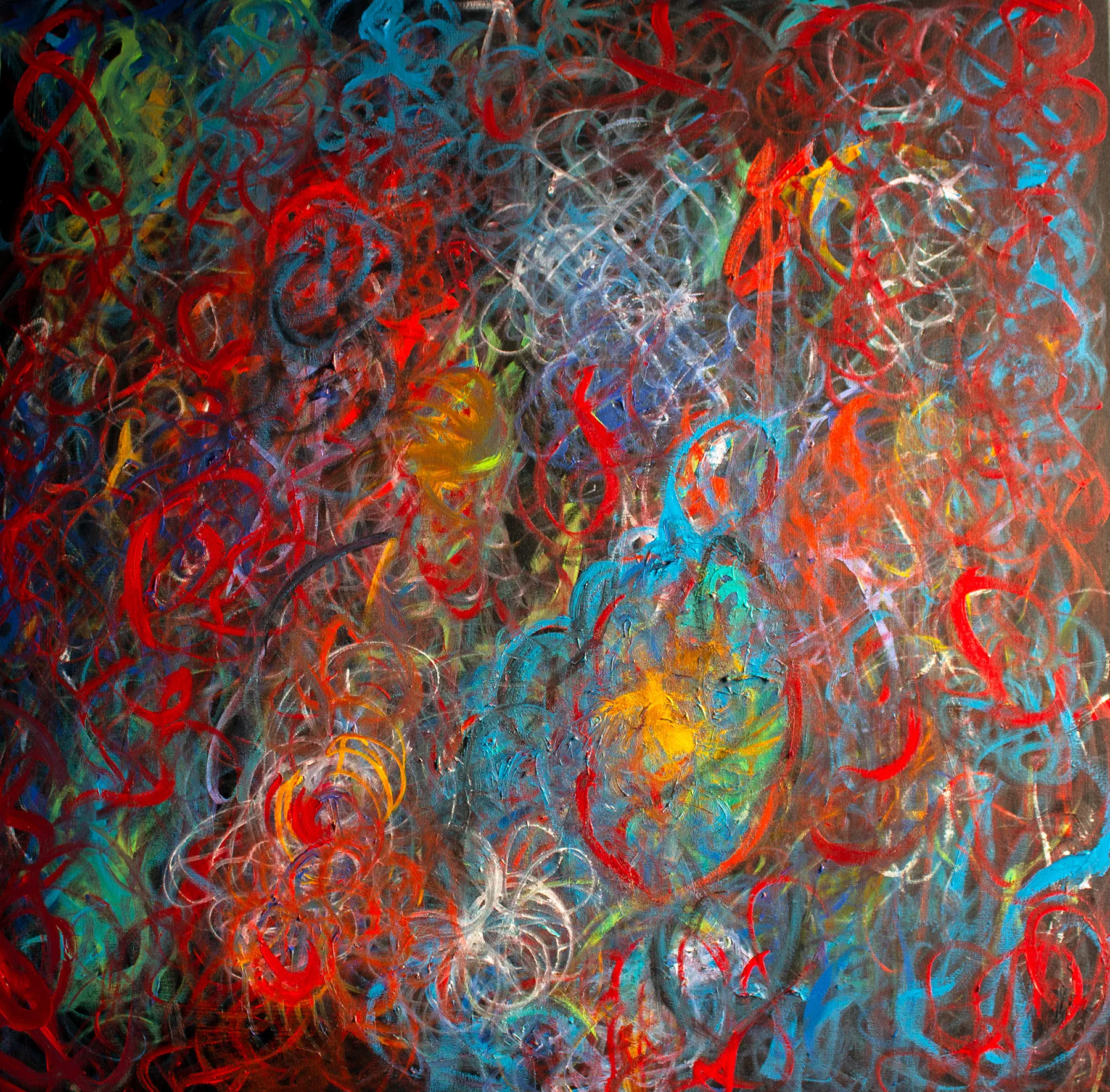 This painting evolves through layered circular gestures and overlapping lines that create a turbulent, atmospheric surface. Reds surge through cooler blues and greys, generating a constant push and pull between warmth and depth. Influenced by music, emotional states, and automatic movement, the process relies on repetition and density, allowing energy to accumulate organically and reveal moments of luminosity within the chaos.
