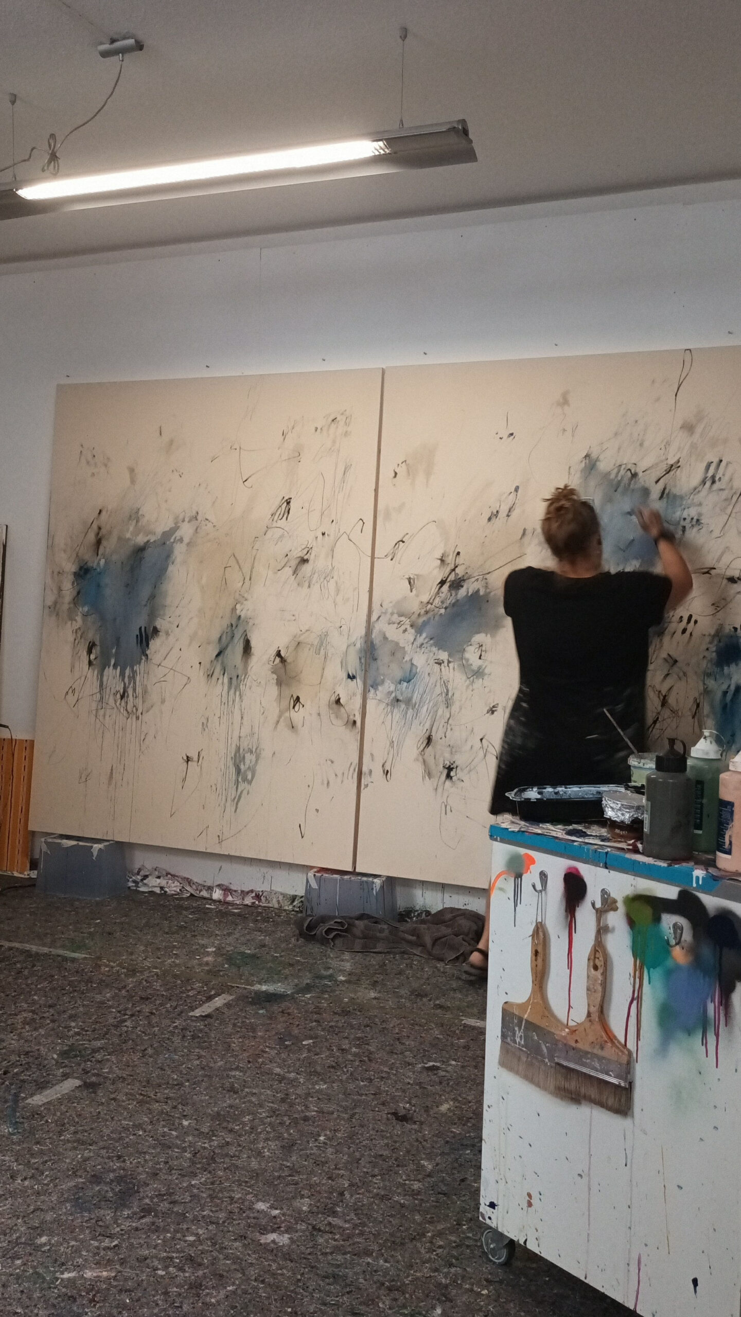 Her predominantly large‑scale works emphasize the raw artistic process, shaped by an intense, physical, and intuitive approach to painting. Exploring contrasts - color and non‑color, line and field, light and darkness -, she creates dynamic compositions that balance chaos and order. Her paintings are defined by energy, vibrancy, and emotional immediacy, inviting viewers into a space where perception and feeling intersect.