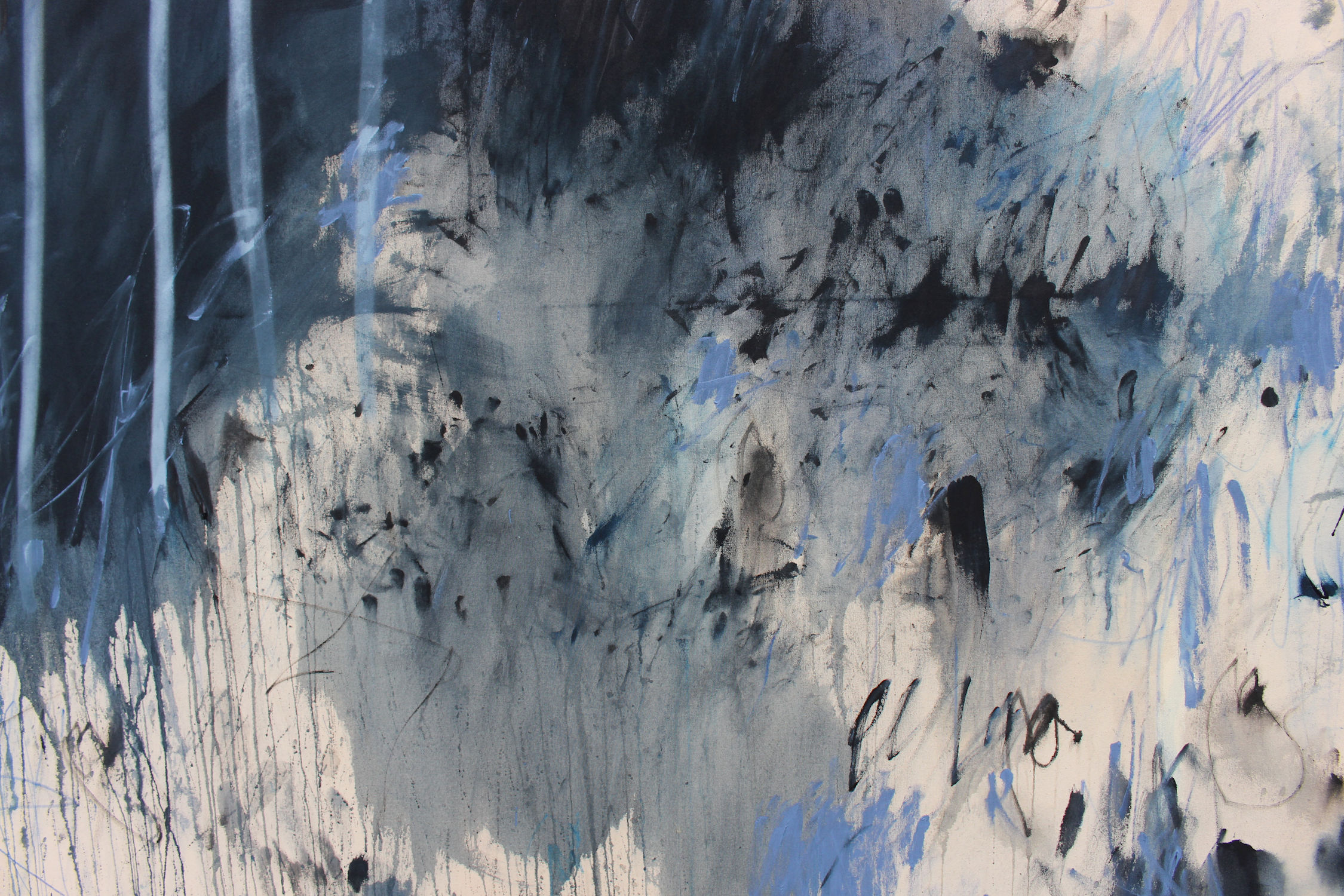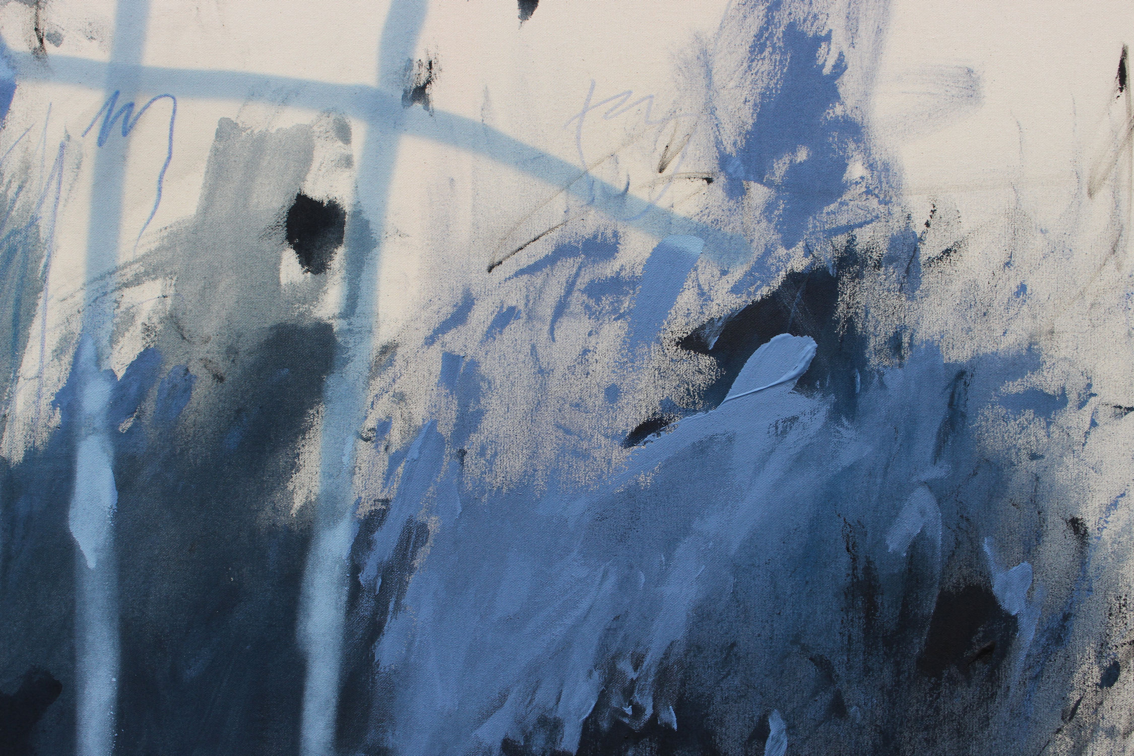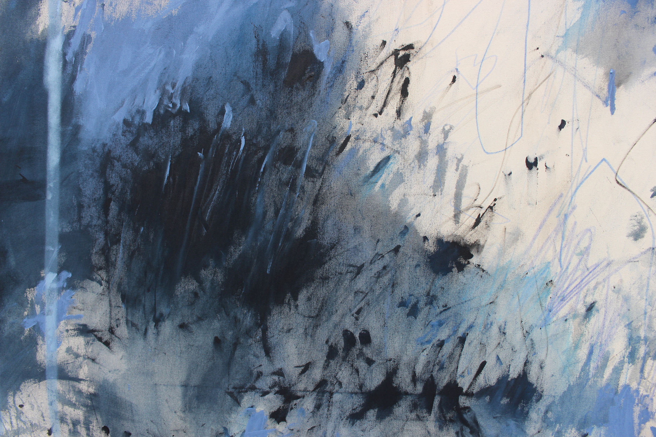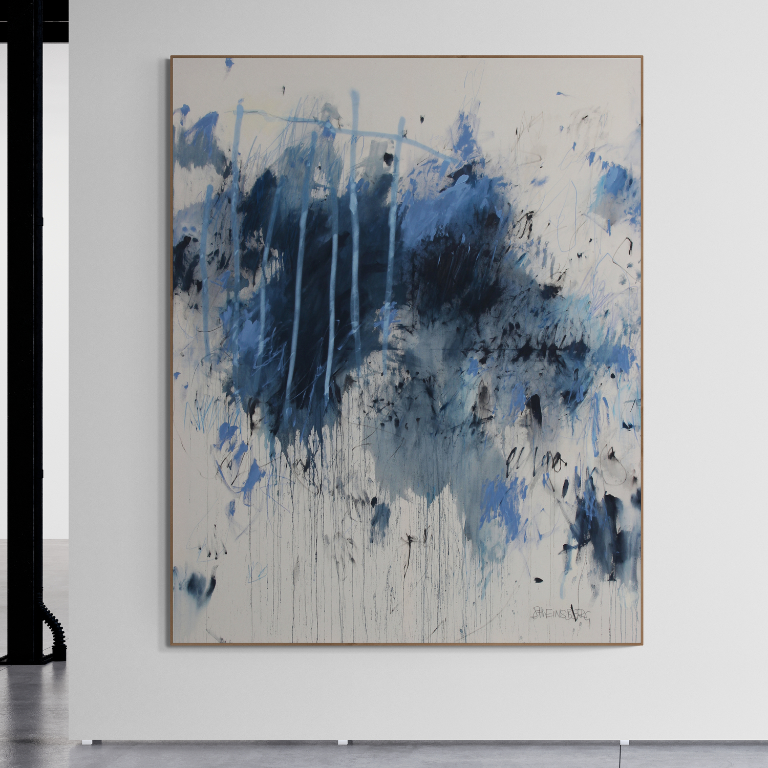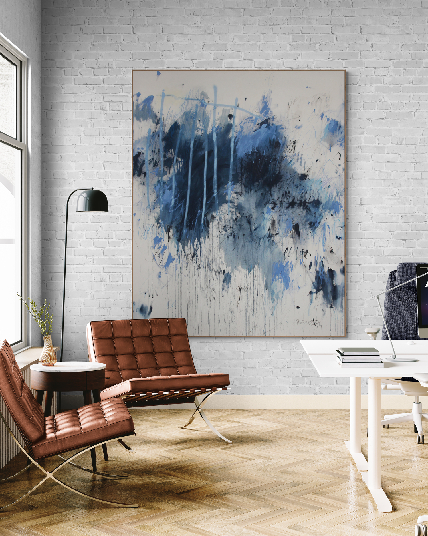 “REVELING IN BLUE 2” grew from pure joy in the material. I applied most of the paint with my hands to create a direct, physical trace. This nearly monochrome abstract painting explores the power of blue, the color of sky and water, symbolizing calm, depth and trust, and the tension between form, line, light and dark. A vibrant piece of contemporary abstract art.