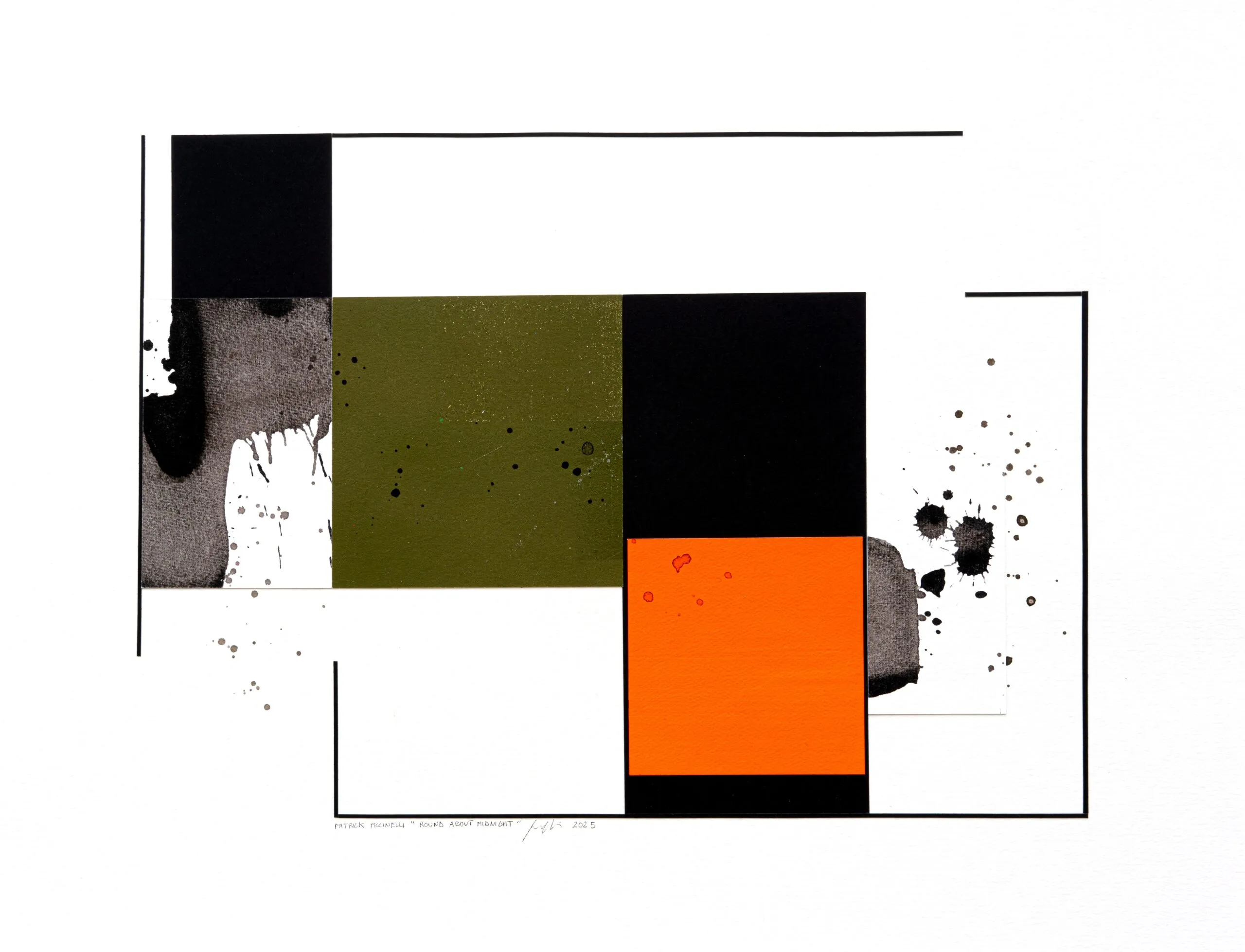 This abstract work entitled “Round About Midnight” establishes a dialogue with jazz, and particularly with Archie Shepp's interpretation of Thelonious Monk's standard. The splashes and drips are reminiscent of abstract expressionism, but also of the spontaneity of jazz. Like Shepp, who reinterprets and deconstructs standards with his bold phrasing, I deconstruct pure geometry through spontaneous gestures, creating tension between structure and freedom.