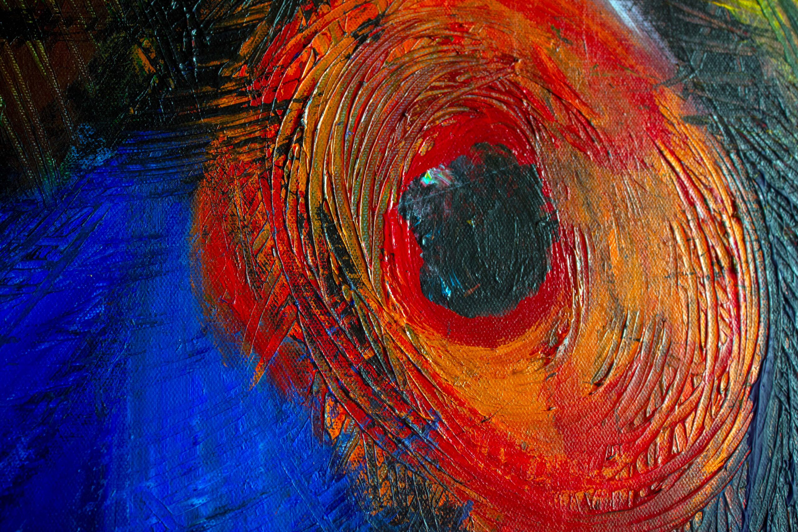 This intense composition radiates emotional turbulence, created using bold brushstrokes and a palette knife. Influenced by inner unrest and cosmic symbolism, the work evokes the sensation of being watched by an all-seeing force. Layers of vibrant color swirl into a hypnotic, fiery vortex, echoing the mythic eye of chaos.