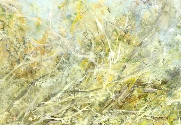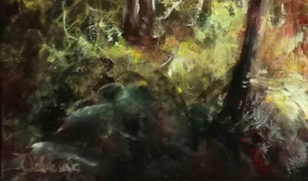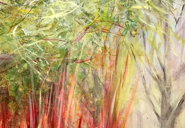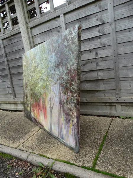 I painted this piece with the intention of capturing that magical moment when sunlight filters through a woodland and suddenly everything feels lighter, softer and full of possibility. I wanted the trees to feel almost weightless, their branches weaving together in a delicate canopy, with warm streaks of crimson and gold suggesting shafts of light breaking through. The misty glow in the distance adds a sense of calm and quiet, as if the world pauses for a breath while colours shift and settle.