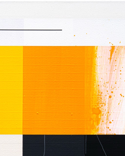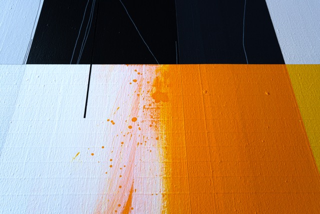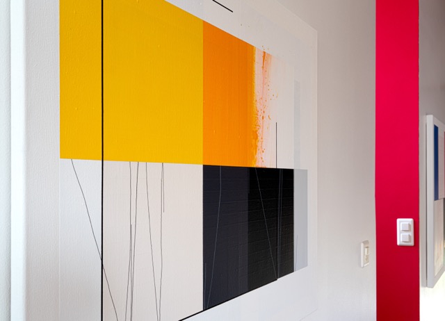 This abstract work establishes a dialogue between John Cage's music and my painting. The visual composition plastically translates Cage's principles. There are seven areas: the blocks of color (bright yellow, orange, deep black, gray-blue) and the spaces between them create a segmentation that evokes Cage's seven haikus.