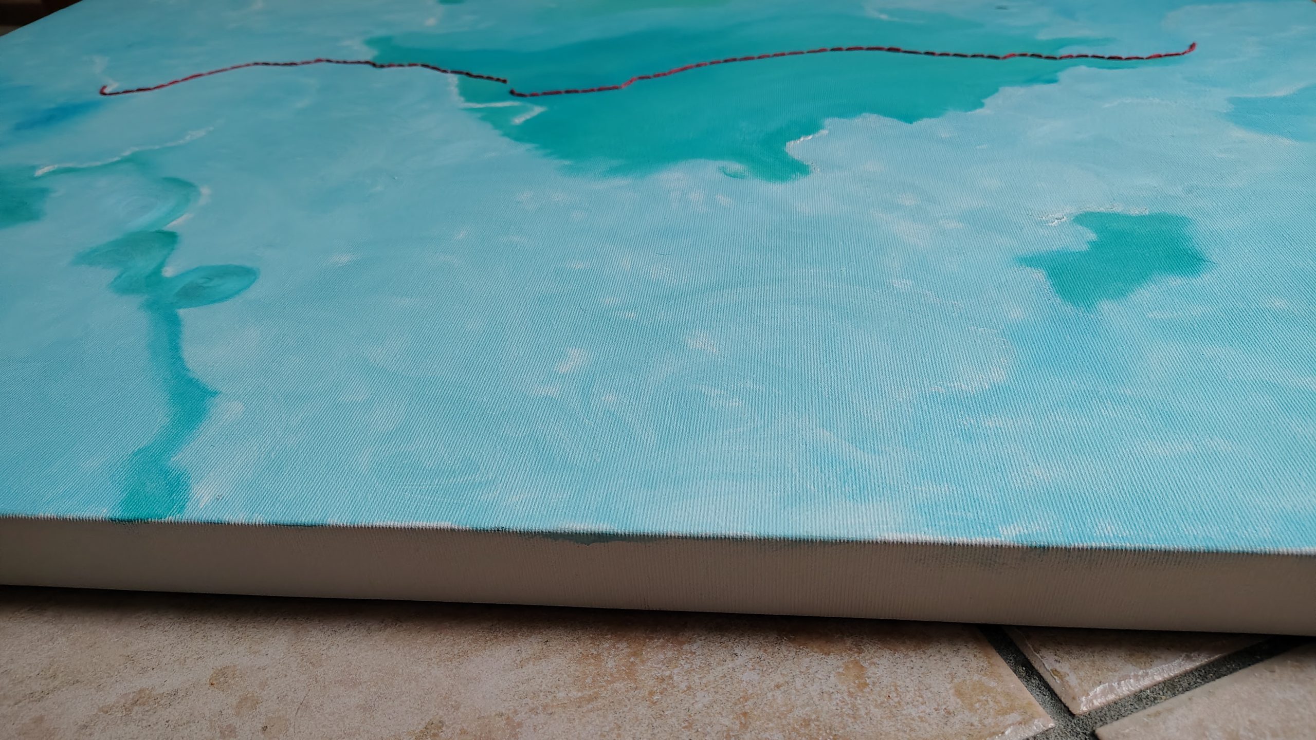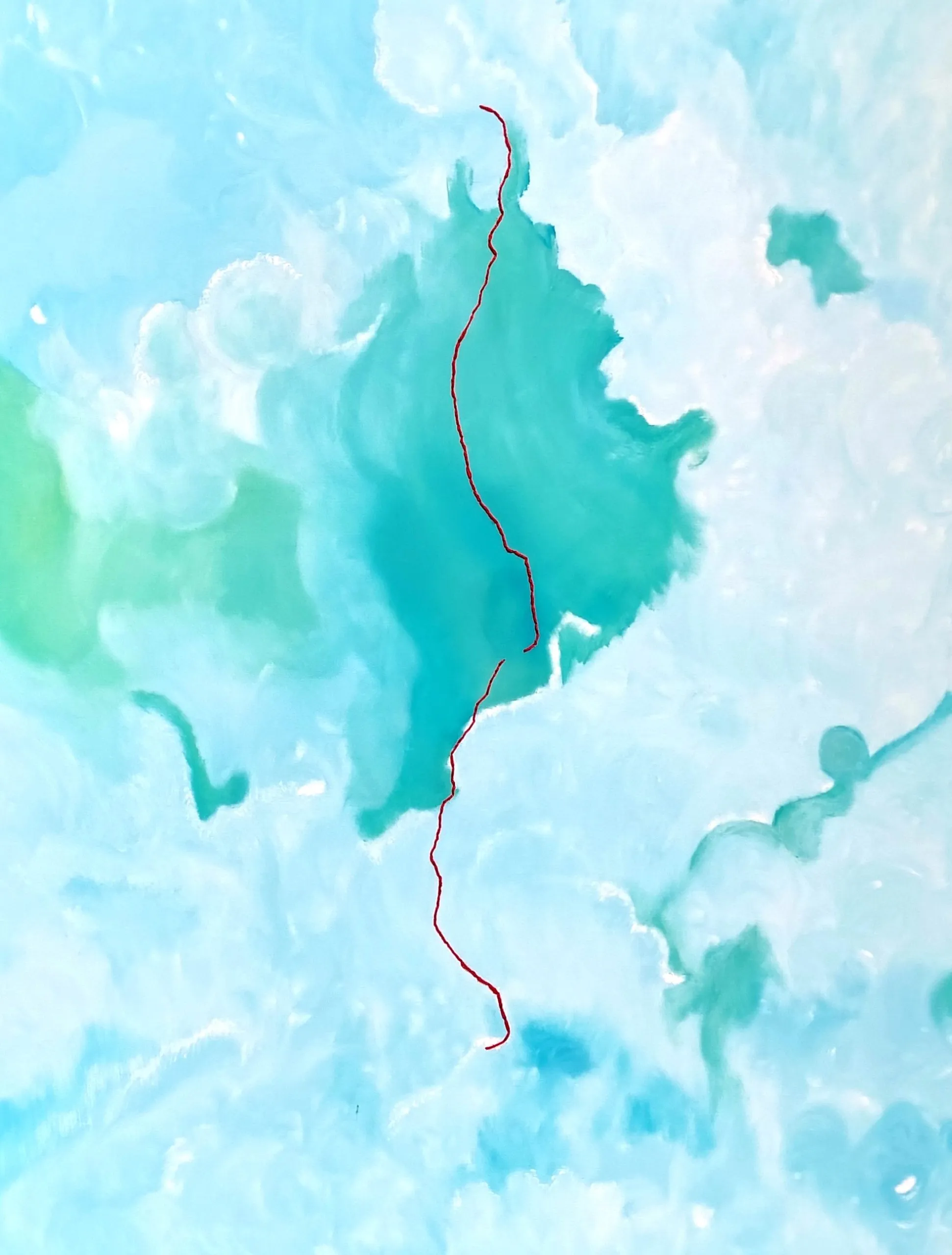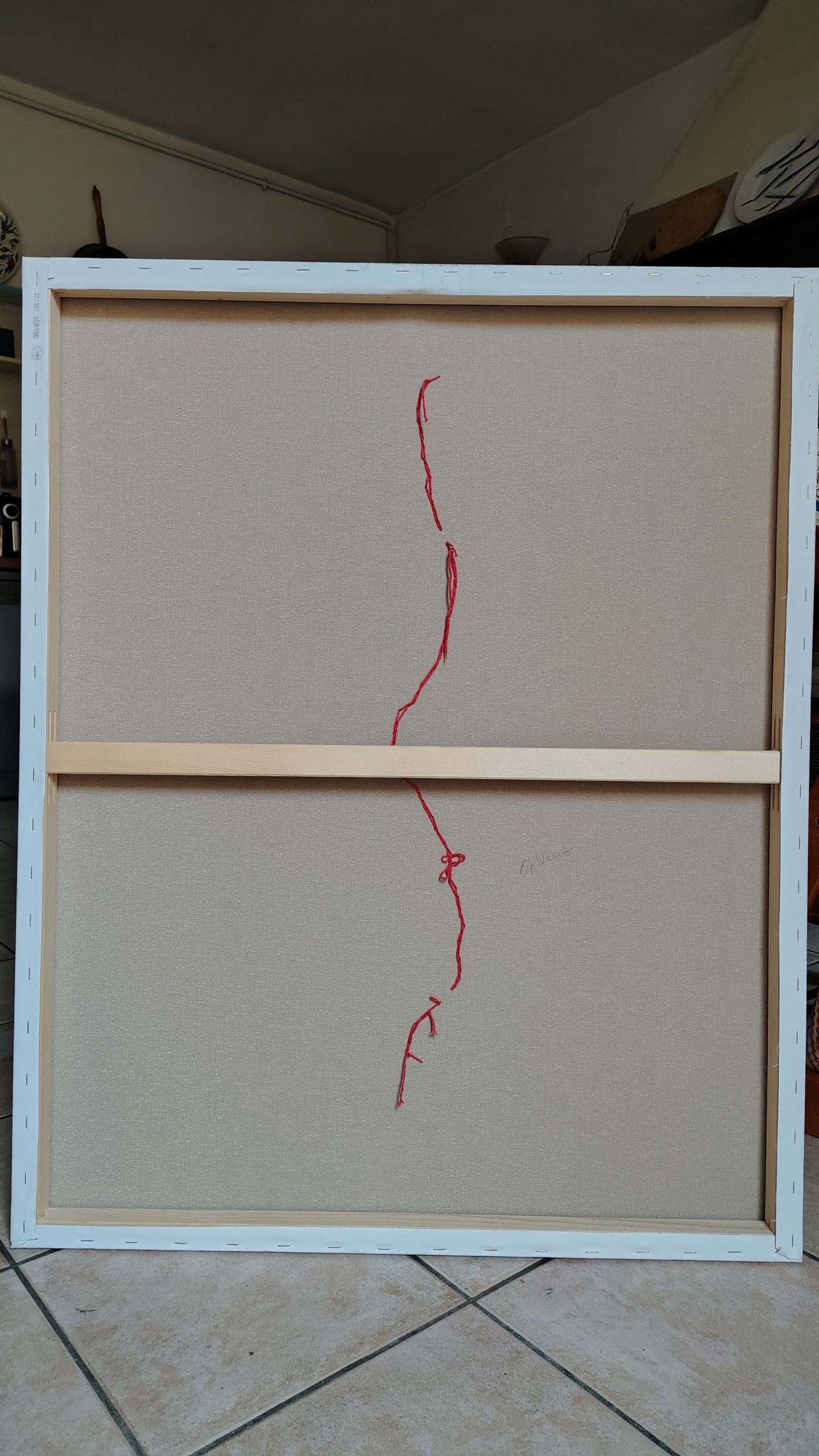 In this work, I combined oil paint with the delicate technique of embroidery to capture a moment suspended between reality and dream. The thread, thin and vibrant, runs across the canvas like a line of invisible energy, a symbol of connection and introspection. The sky is always following us in every instant of our lives. I want those who observe it to feel the stillness and the endless flow, bringing a sense of peace and depth into the space where it is displayed.