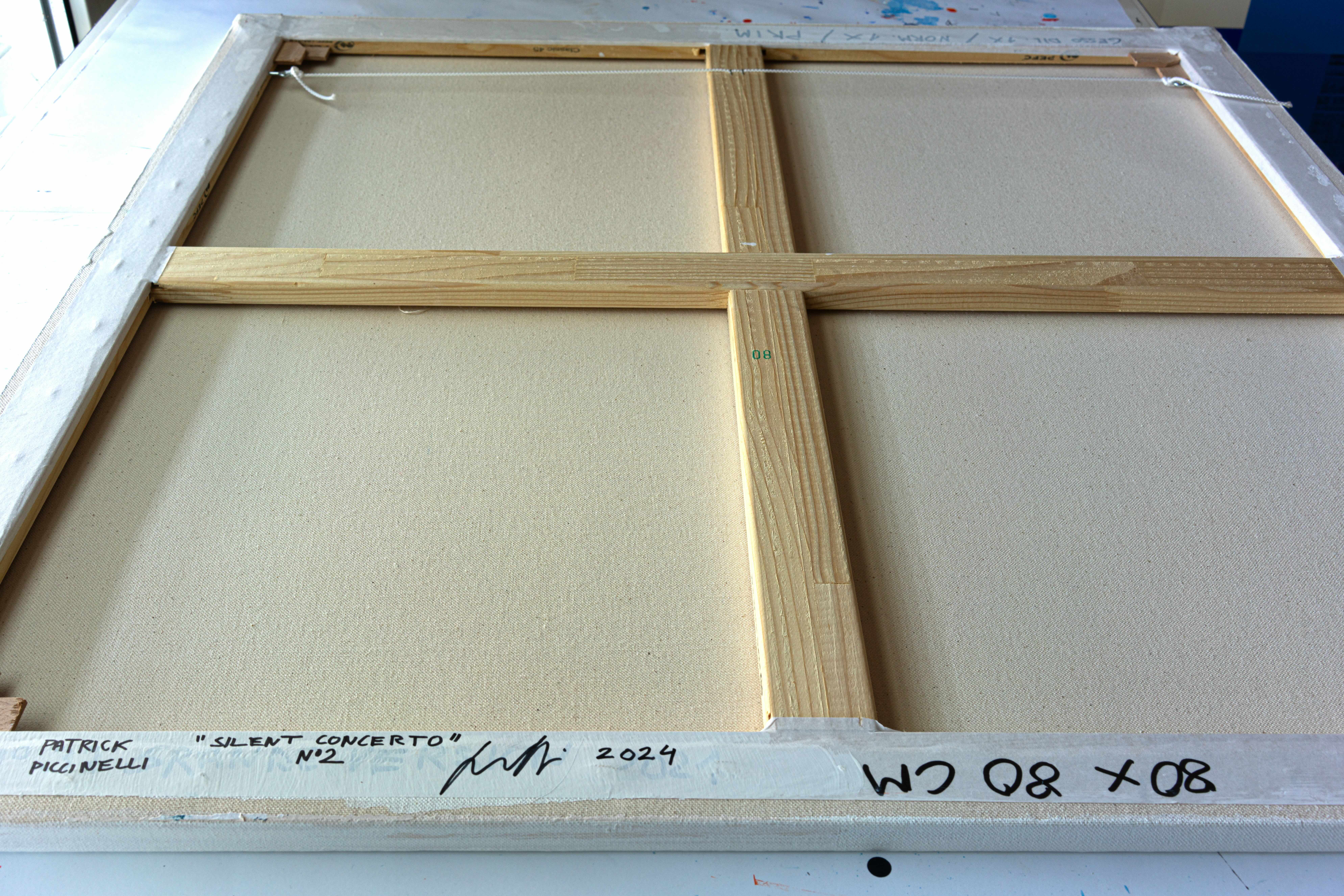 This work on canvas evokes the music of Olivier Messaien. This 20th-century French composer is renowned for his approach to music, in which silence plays a crucial role. Messiaen uses silence to structure his compositions. These silences allow listeners to contemplate the sounds that have just faded away. Similarly, in my painting, the use of smooth, nuance-free geometric areas highlights the improvised drawings, splashes, and splatters.