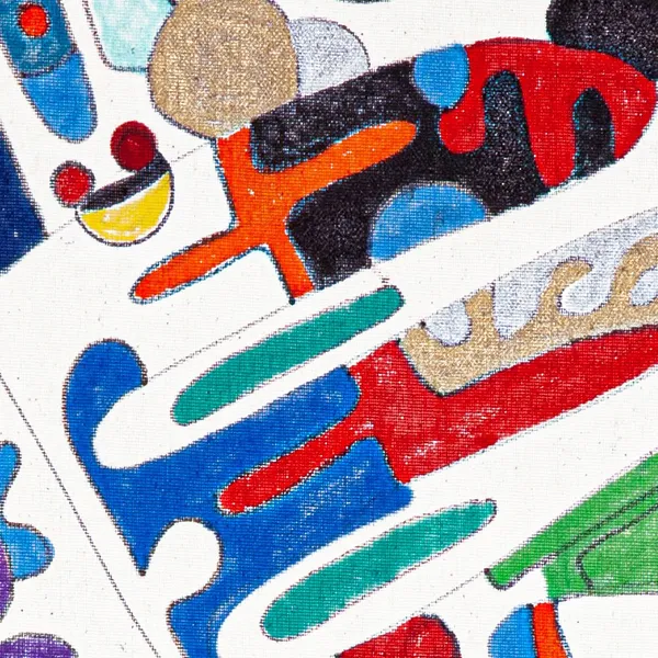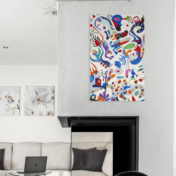This composition develops through free, automatic line drawing, where a central elongated form organizes a dense constellation of biomorphic figures. Influenced by Surrealist automatism, Miró’s playful abstraction, and Paul Klee’s symbolic visual language, the work unfolds as a rhythmic landscape. Vivid, hand-applied color areas interact with softer tonal zones, creating a sense of circulation, metamorphosis, and narrative fragments that suggest movement, memory, and inner worlds.