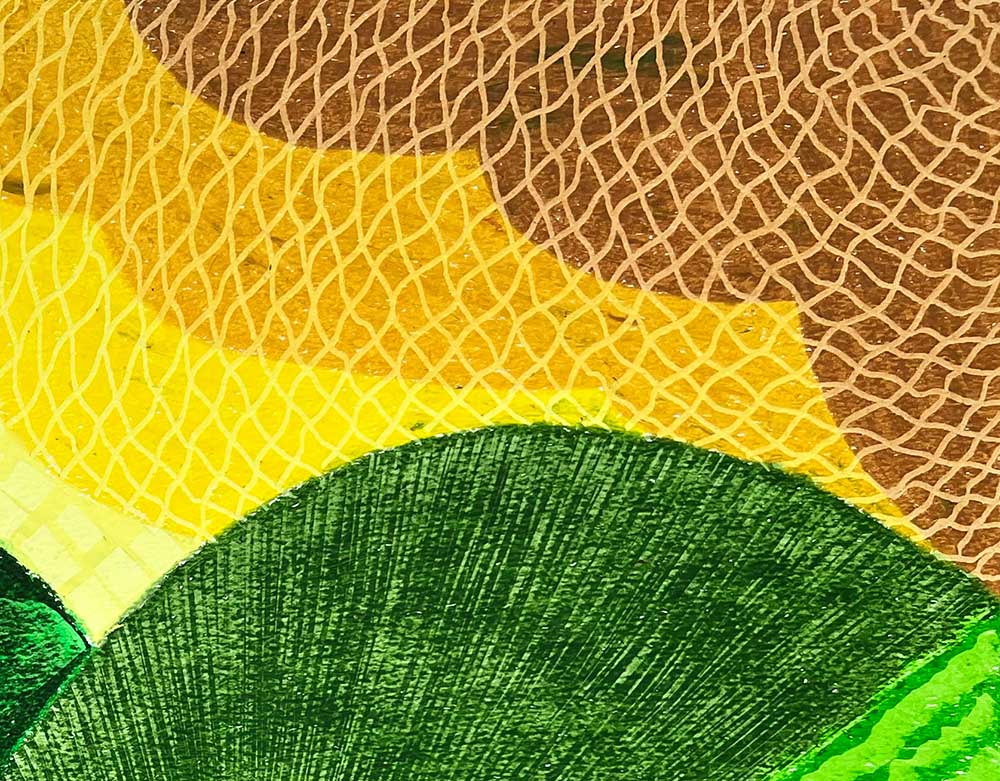 Dominating the composition are rolling green hills, meticulously detailed with woven textures and featuring intricate grid-like designs. Above, the sky glows with a warm range of yellows and ochres. The fluid transition between the luminous sky and the textured landscapes creates a visual rhythm that immerses one in a harmonious and balanced scene. This piece fuses natural forms with abstract patterns, inviting reflection on the interplay between order and chaos in the natural world.