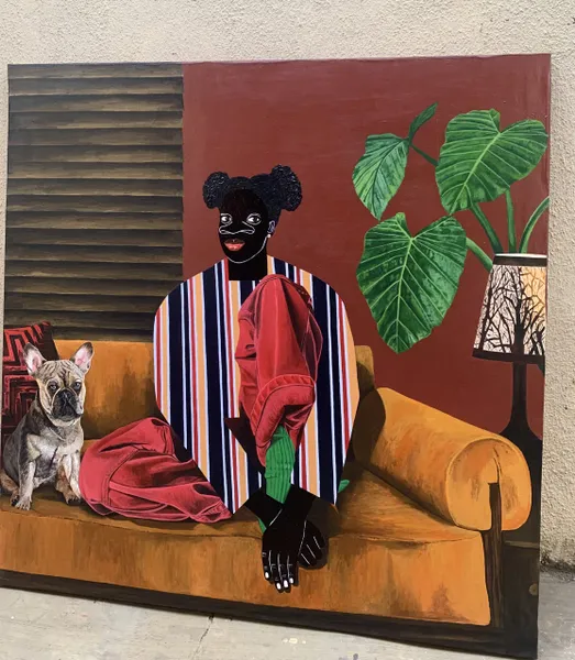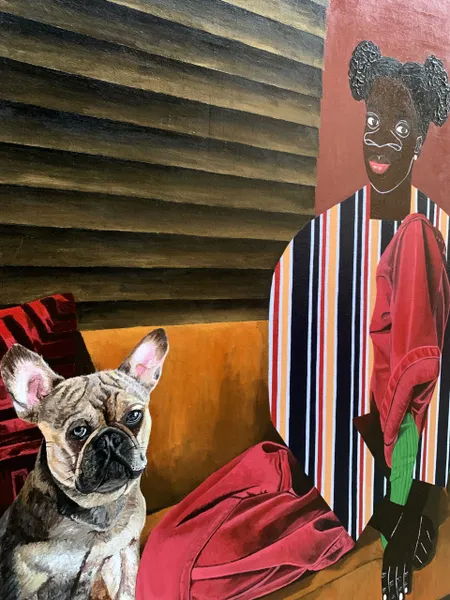 Capturing a serene moment of a woman seated on a couch beside her dog. Bold colors and dynamic patterns draw the eye, while the woman’s striped shirt layered with a red dress adds a striking visual rhythm. Surrounding details, a warm lamp glow, lush greenery, wrap the scene in a sense of comfort and intimacy. Together, these elements transform a simple domestic setting into a celebration of everyday beauty, companionship, and quiet joy.