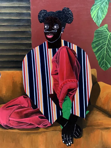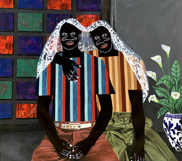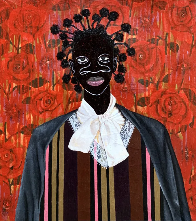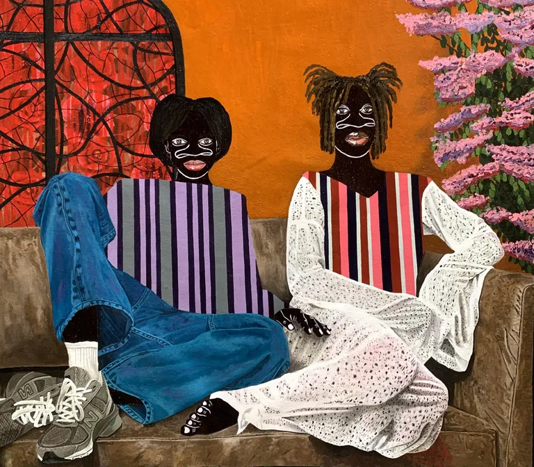 Akintomide Akinshola (b. 1995) is a contemporary visual artist from a lineage of crop farmers in the historic city of Ondo, Ondo State, Nigeria. He currently lives and works in Lagos. From a young age, he showed a deep curiosity for art, experimenting with everyday materials to express his imagination. This early passion guided him toward a degree in Fine and Applied Arts Education at Obafemi Awolowo University, Ile-Ife.Over the years, Akintomide has participated in several group exhibitions both in Nigeria and abroad, steadily building a distinctive visual language. Akintomide’s artistic practice explores identity, culture, and the complexities of human relationships. Through the use of ink and acrylic compositions, he creates figurative pieces that reveal the beauty, fragility, and resilience of human bonds. His exaggerated facial features, especially the nose serve as both personal symbol and narrative device, rooted in childhood experiences of being taunted, yet transformed into marks of strength and individuality.Influenced by his environment, cultural heritage, and personal experiences, Akintomide captures intimate scenes that invite reflection on how relationships shape and transform us. He also brings together African and non-African fabric patterns, reimagining their historical and cultural connections. Through this fusion, his art becomes both a celebration of shared humanity and a visual dialogue on identity, belonging, and the power of connection.
