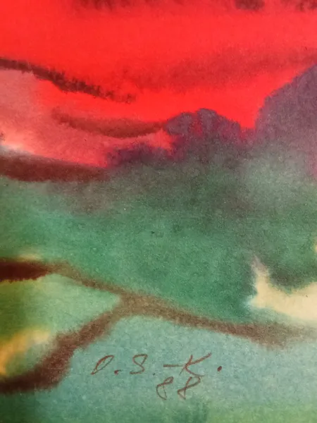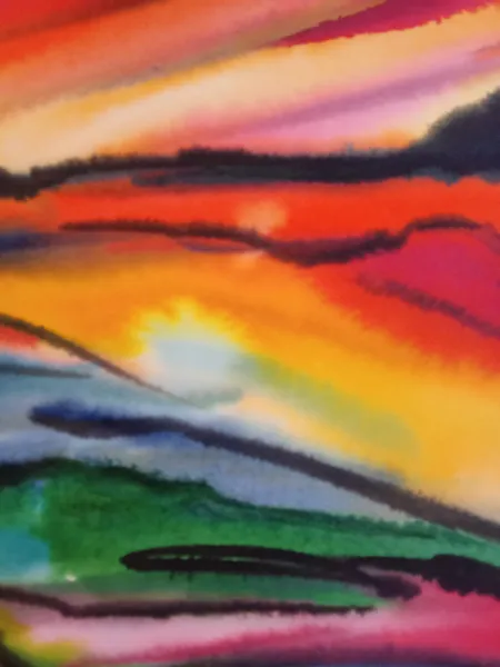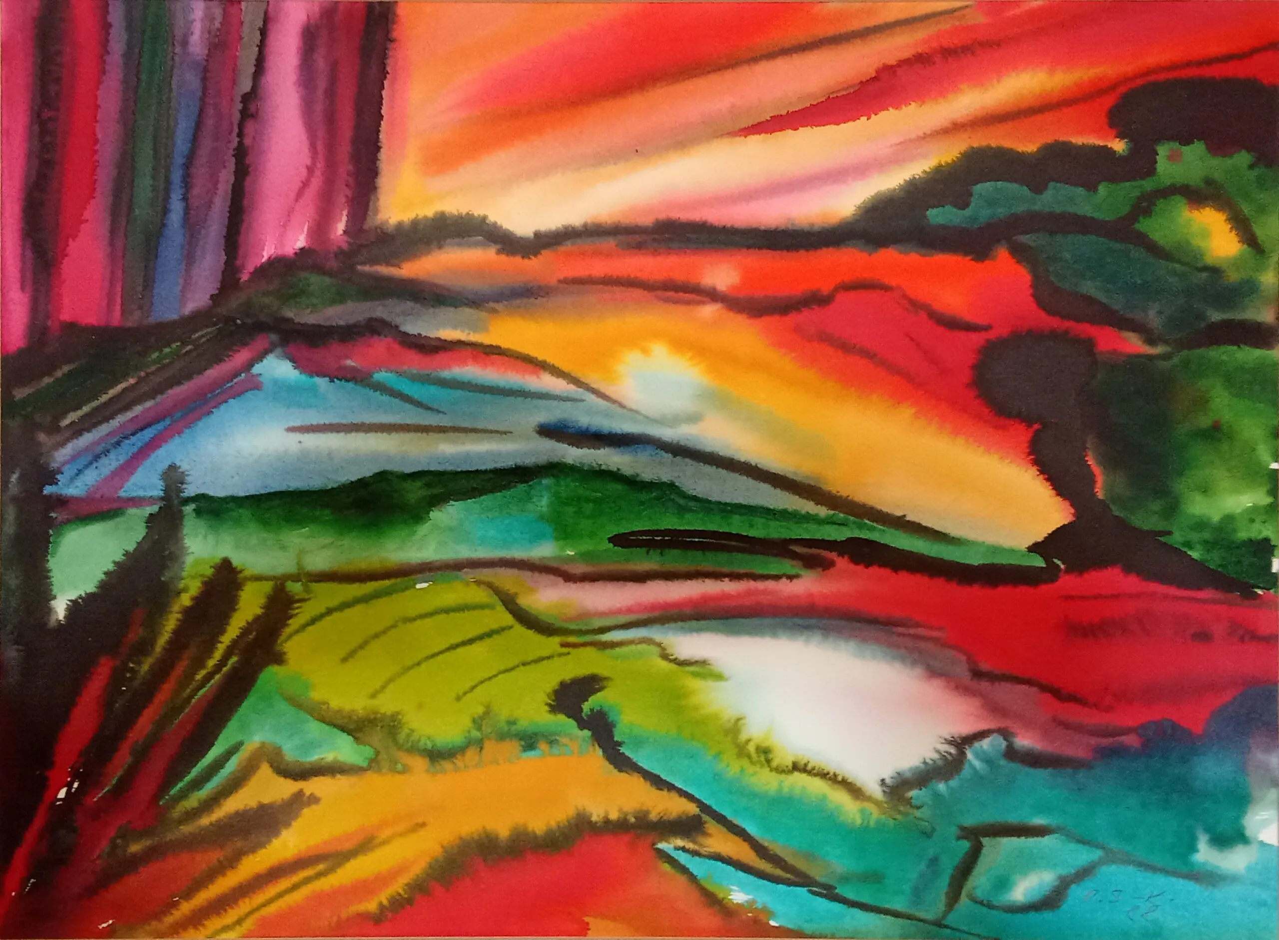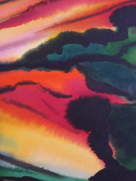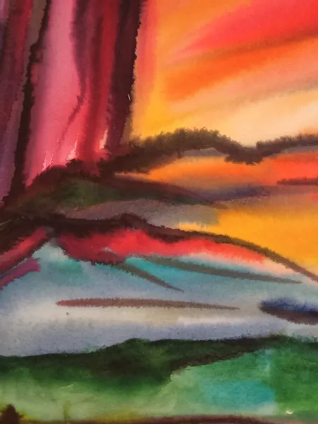 Dans cette aquarelle, empreinte d'expressionnisme et de semi-abstraction, j'ai capturé la vivacité des couchers de soleil.