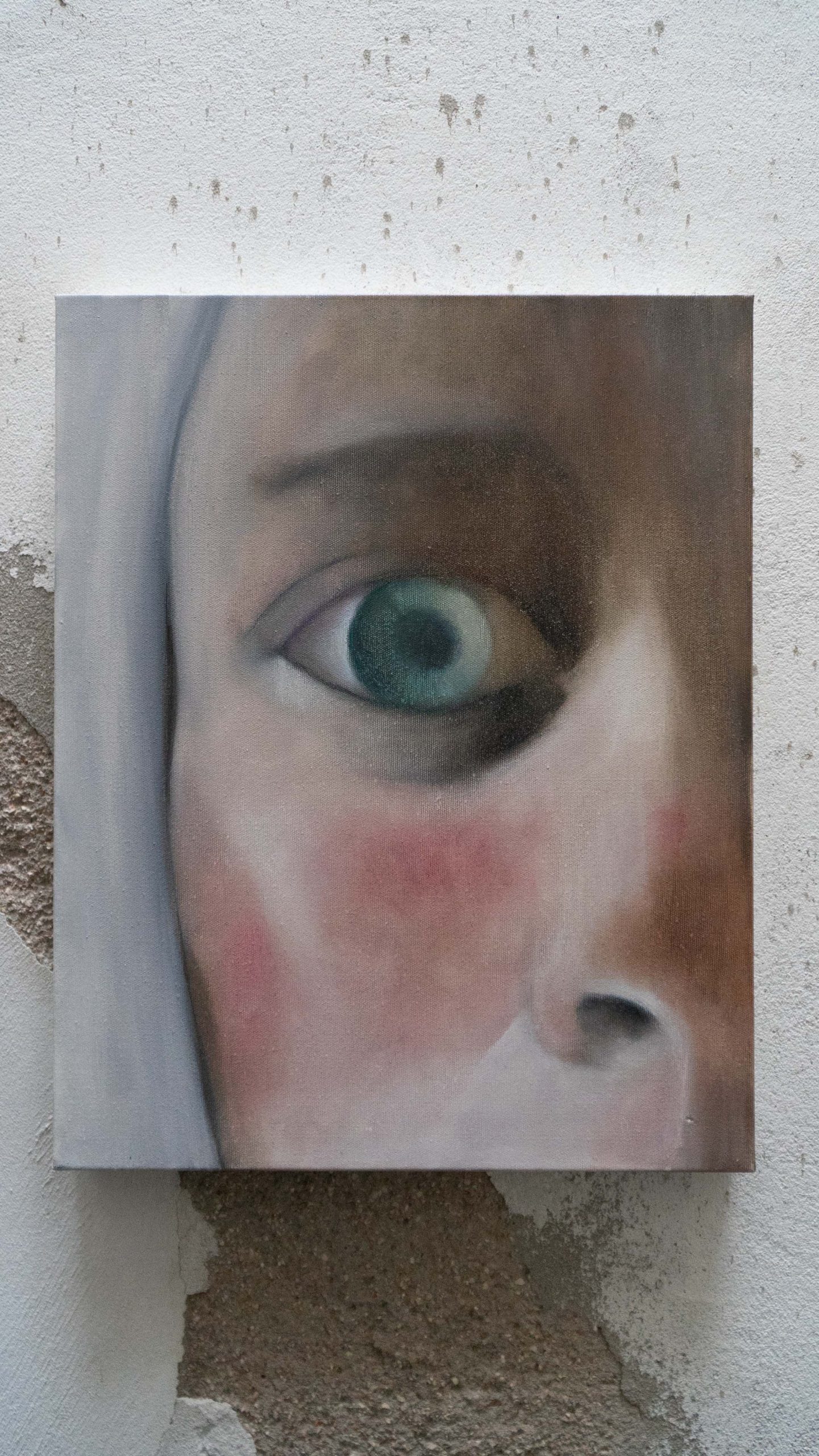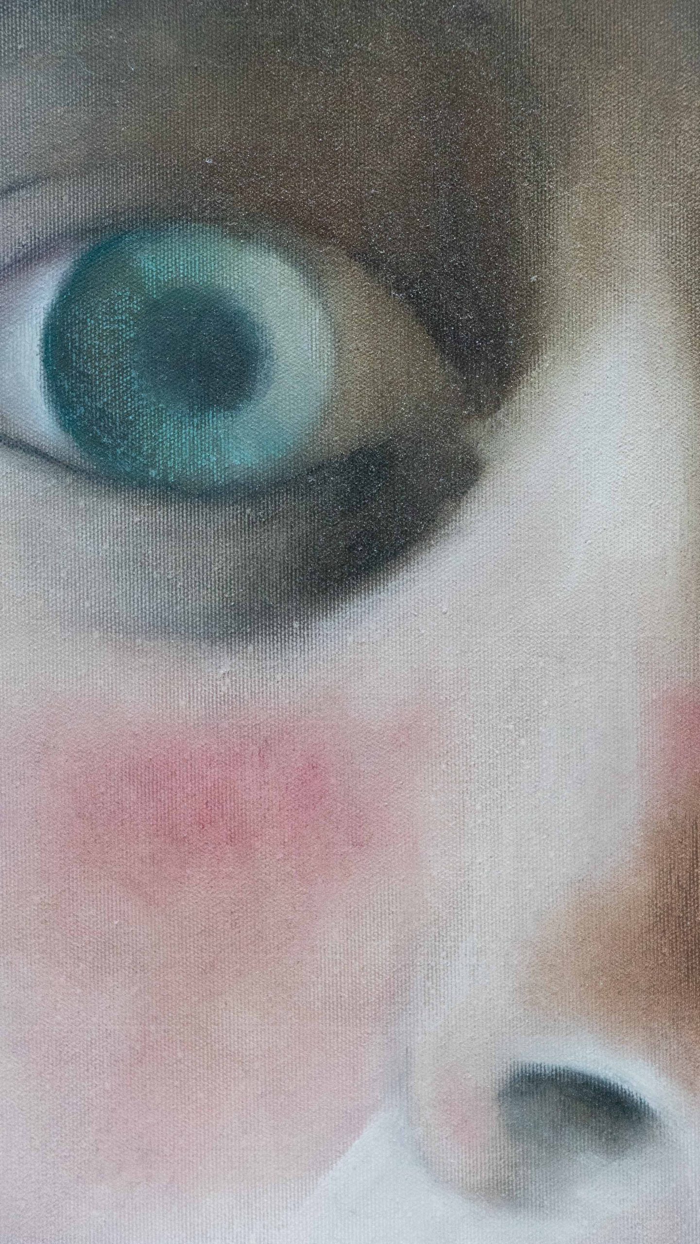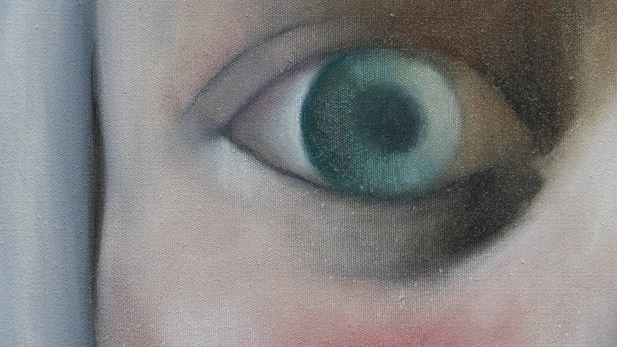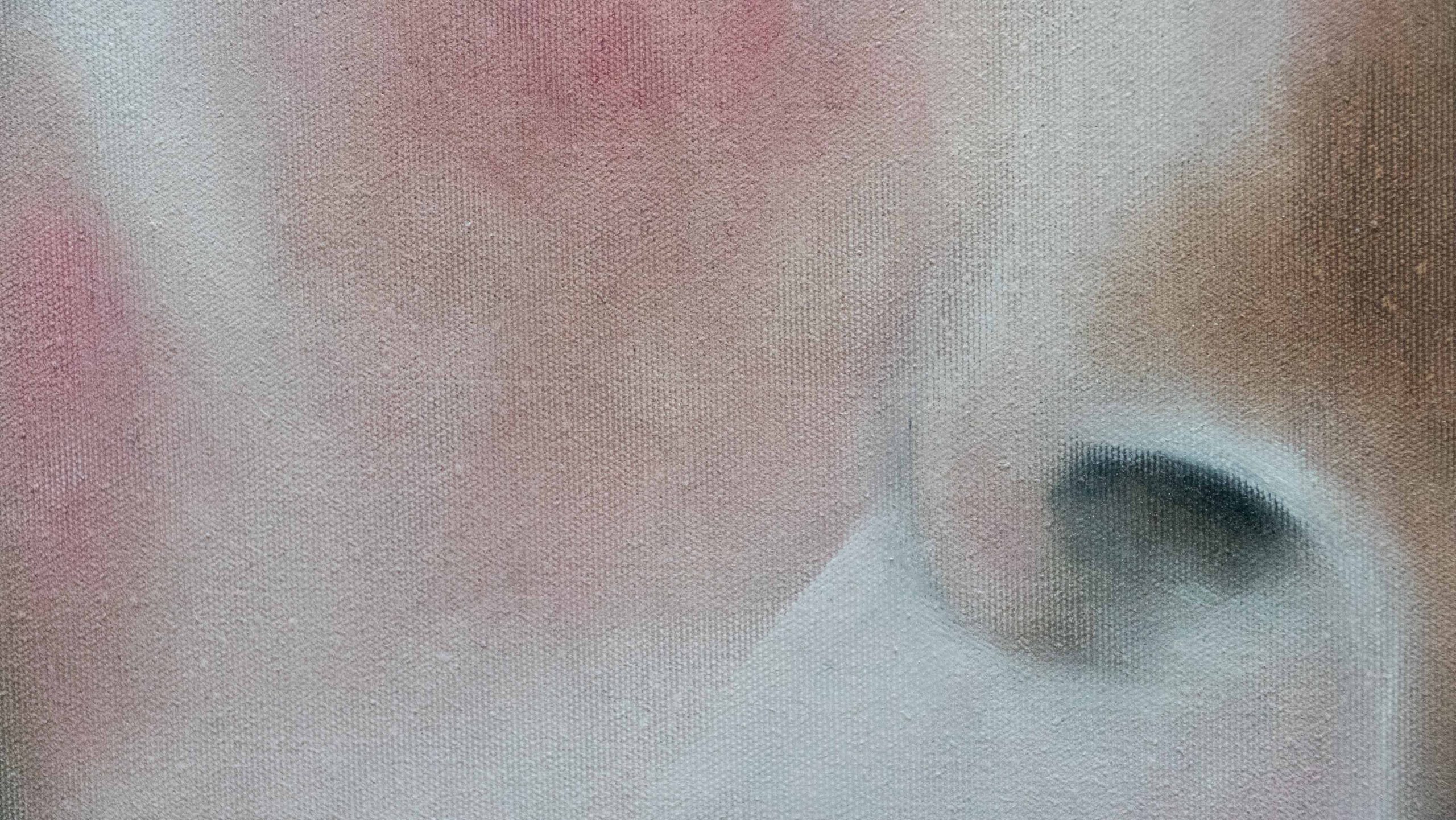 In quest'opera ho creato una texture morbida per esaltare la profondità di uno sguardo surreale, sospeso tra dramma e intimità segrete. Ho usato solamente 3 colori, bianco rosso e bitume, unendo pastelli a olio per migliorarne la definizione.