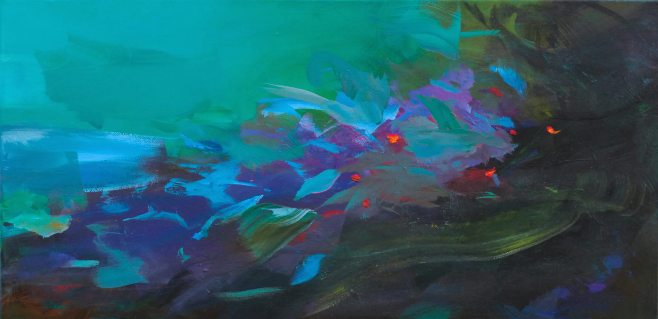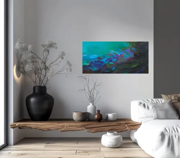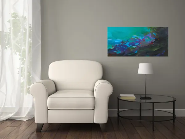 "Spread Your Wings" captures the essence of northern beauty through vibrant pigments sourced from Switzerland. The abstract composition hints at floral and botanical forms, reminiscent of a spring landscape or an underwater scene. Crafted with acrylic on canvas, this original painting showcases a dynamic interplay of blues and greens. This artwork will be shipped in a crate for a safe arrival.