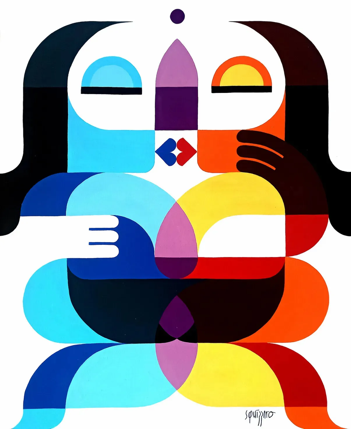 Spring Lovers is part of Antony Squizzato’s series Le Baiser, which reinterprets Brancusi’s iconic works from 1907. Across various mediums (watercolor, ink on paper, acrylic on canvas, mural frescoes, and interactive installations), the artist explores the concept of the couple in contemporary society. Drawing on a personal visual language developed over years of practice, his work emphasizes functional form, purity, and minimalism, a style he refers to as "new constructivism."
