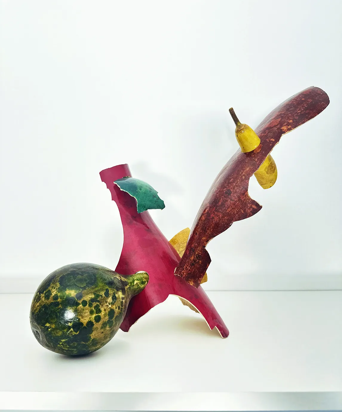 Squash crash N°3 est une sculpture à l'équilibre. Deux fragments de courges longues, comme à la recherche d'un élan sont contrariés par une autre ronde faisant contrepoids. A la faveur de cette effet de masse la sculpture chaotique presque absurde, est stable.