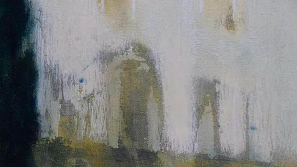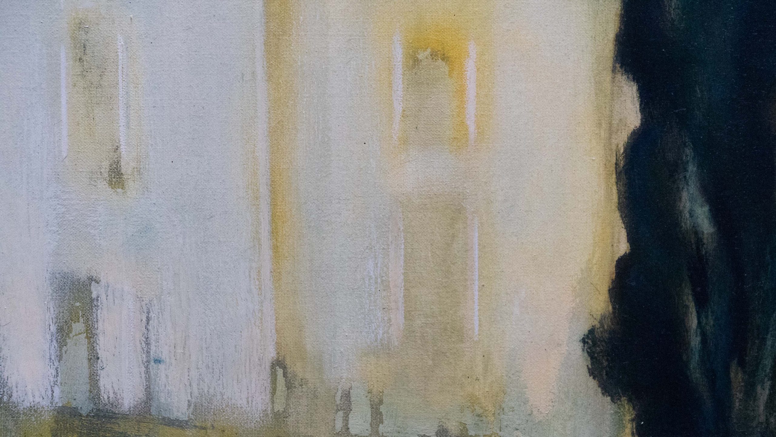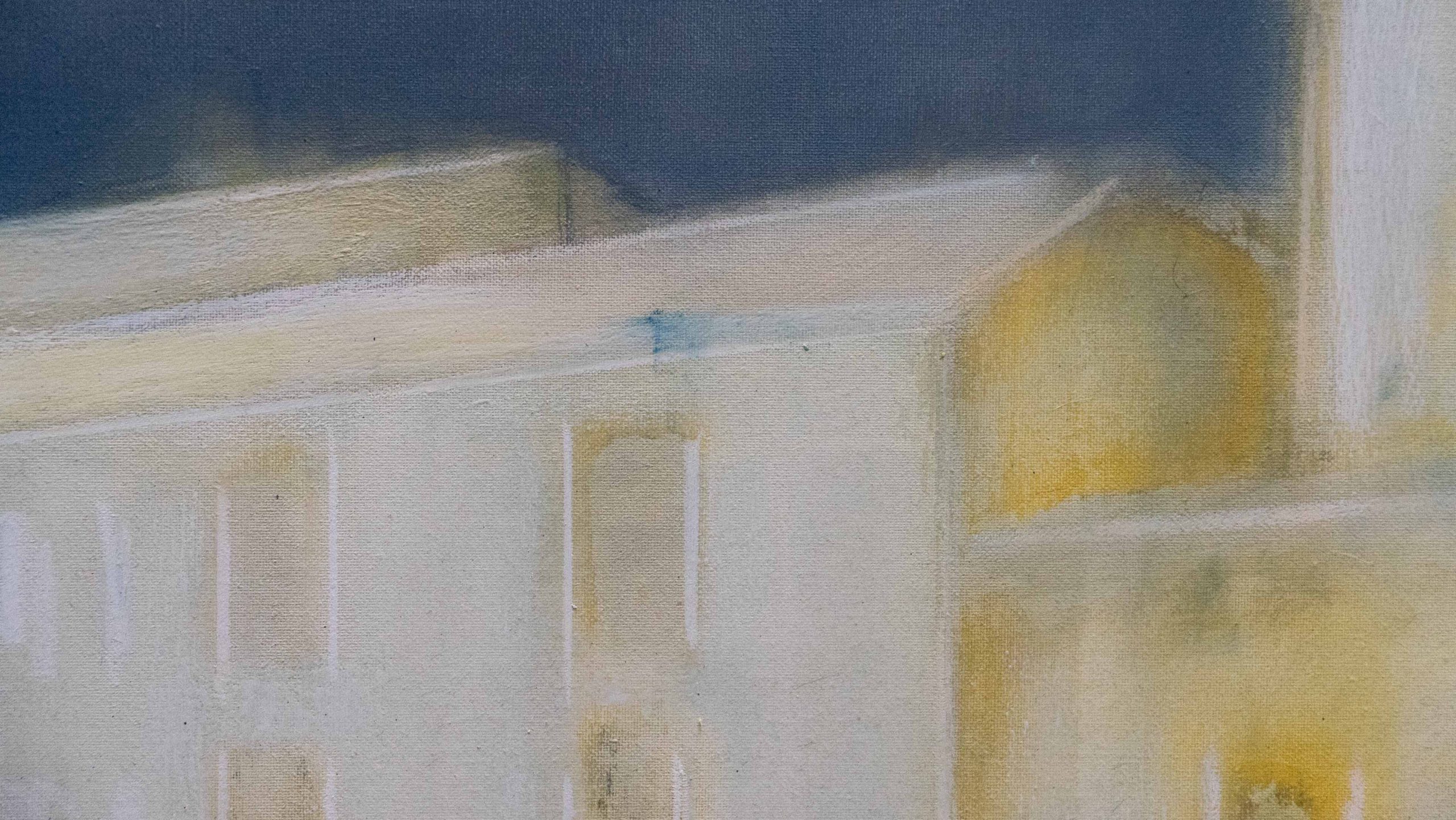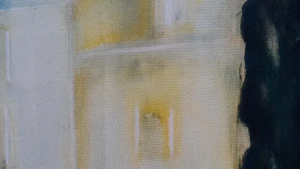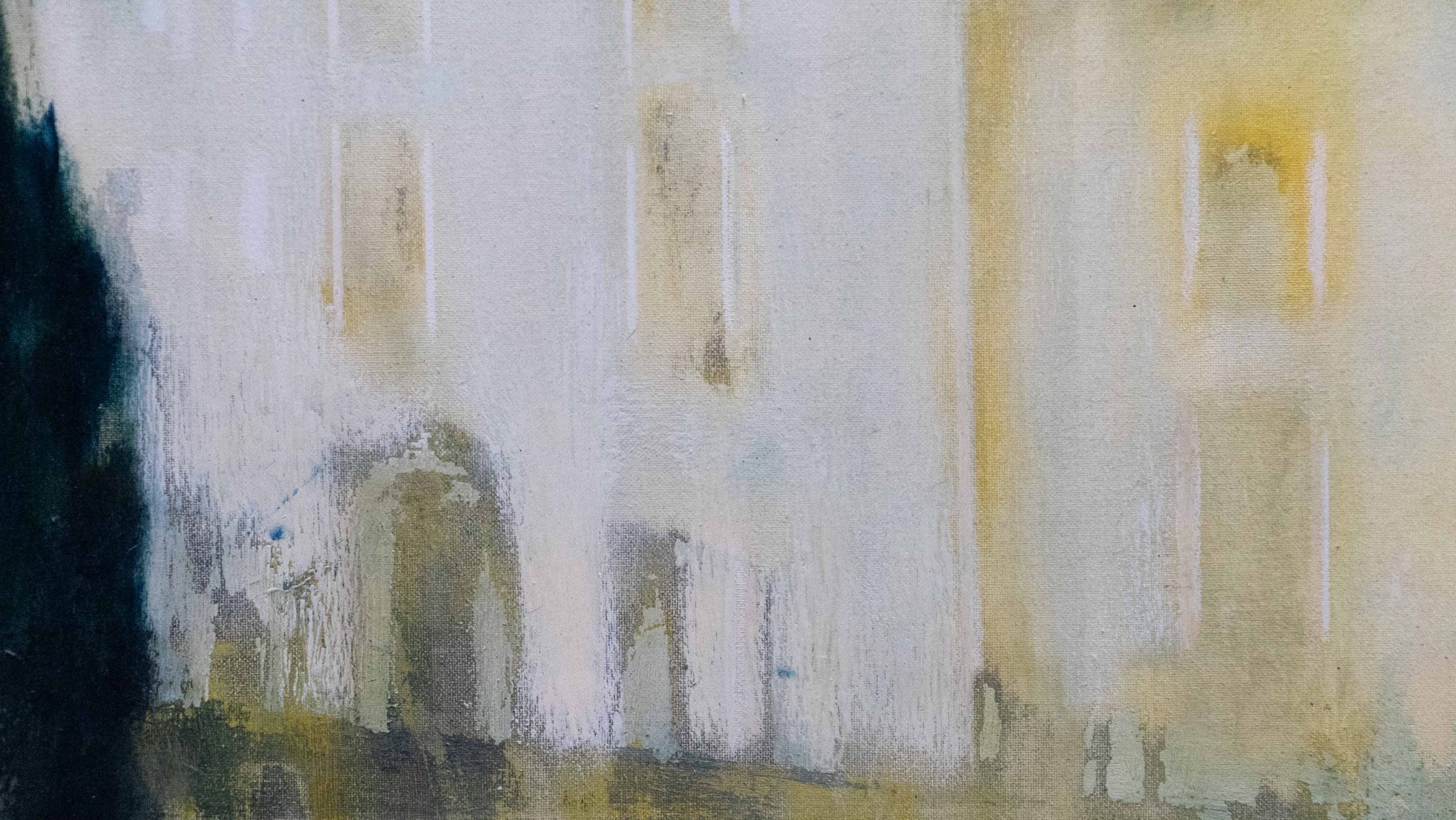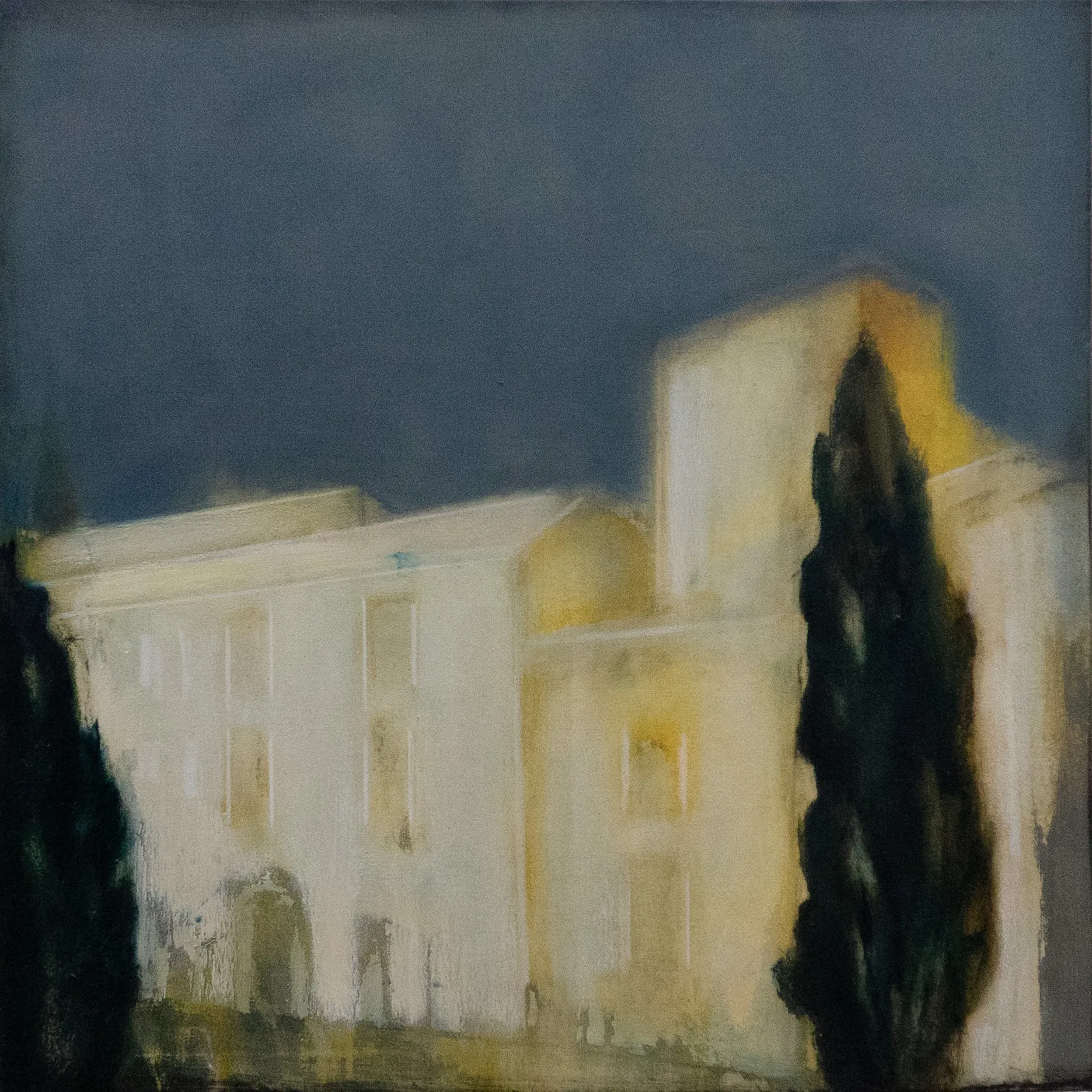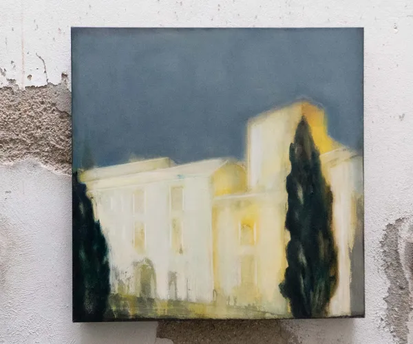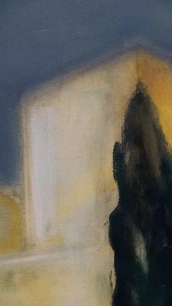 Una visione che giunge da lontano: un antico palazzo ha perso la brillantezza dei colori, ma ha mantenuta intatta la sua bellezza e singolarità, racchiudendo al suo interno segreti non svelati. Il cielo è grigio, ma caldo, c'è una nota di rosso mescolata all'indaco, al nero e al bianco. Il temporale in arrivo forse scolorirà ulteriormente le pareti, ma la suggestione del luogo resterà intatta.