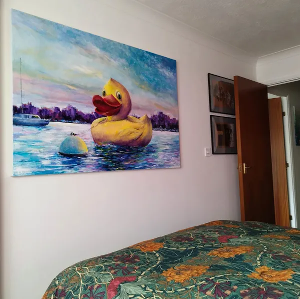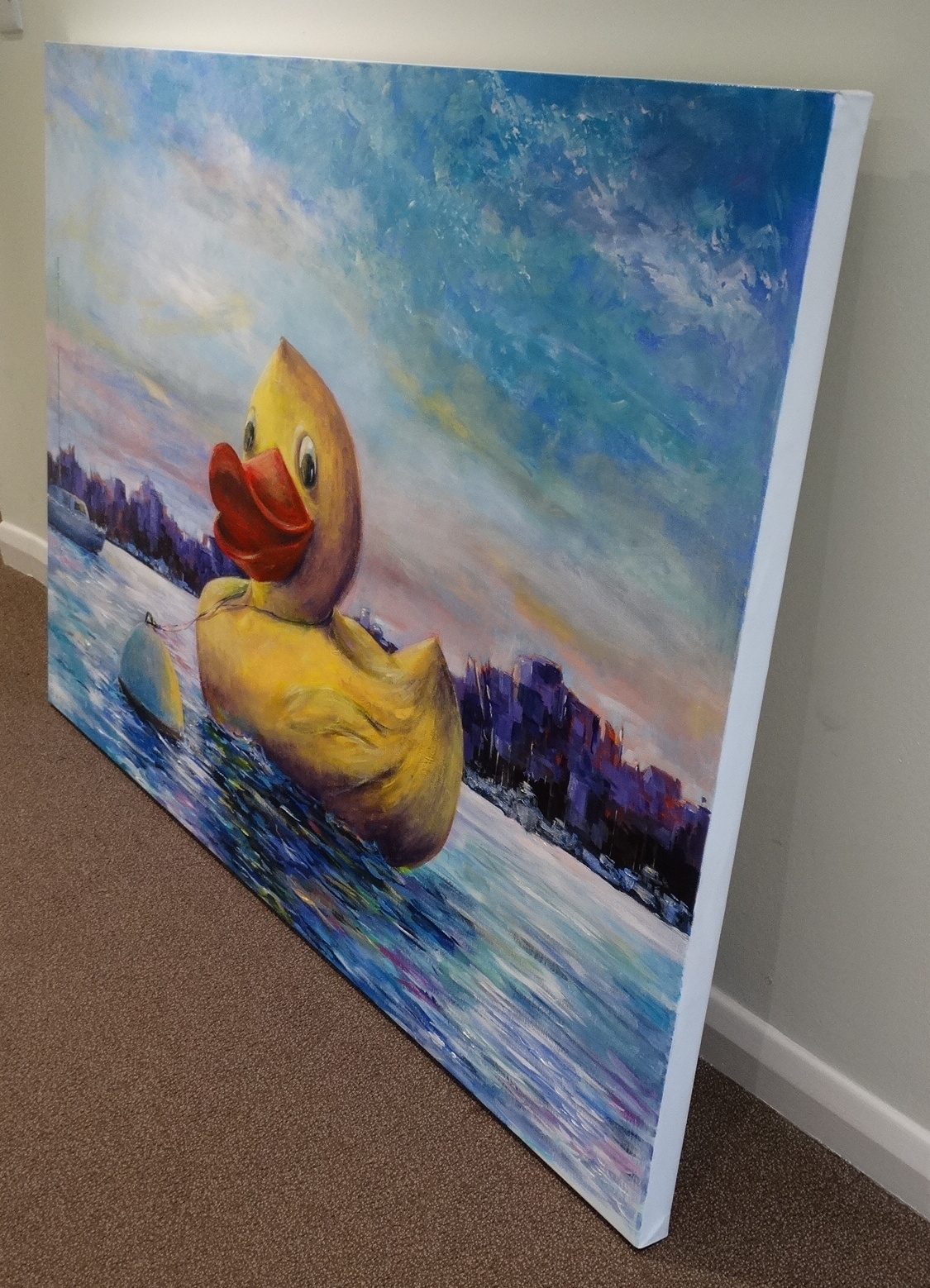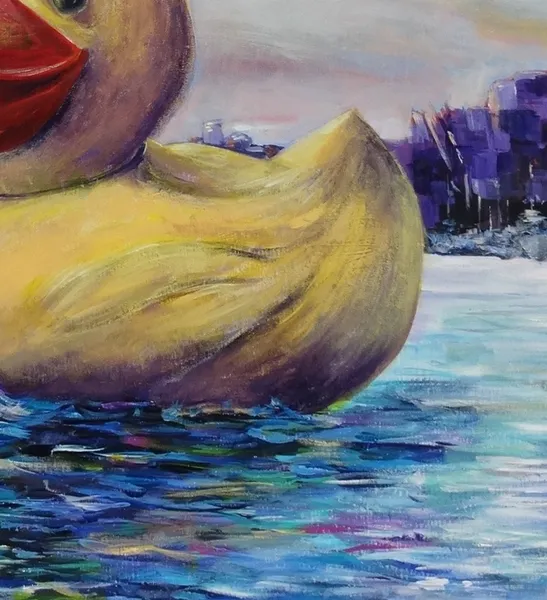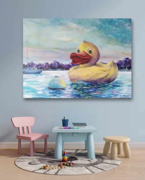 In this vibrant acrylic creation, I've brought surrealism and pop art together to immerse you in a juxtaposition of fantasy and reality. A whimsical, oversized rubber duck floats in a serene cityscape, exuding joy and innocence. This piece embodies the playful contrast within our world, invoking nostalgia and a sense of wonder, aiming to uplift and brighten any space with its boundless charm and color.