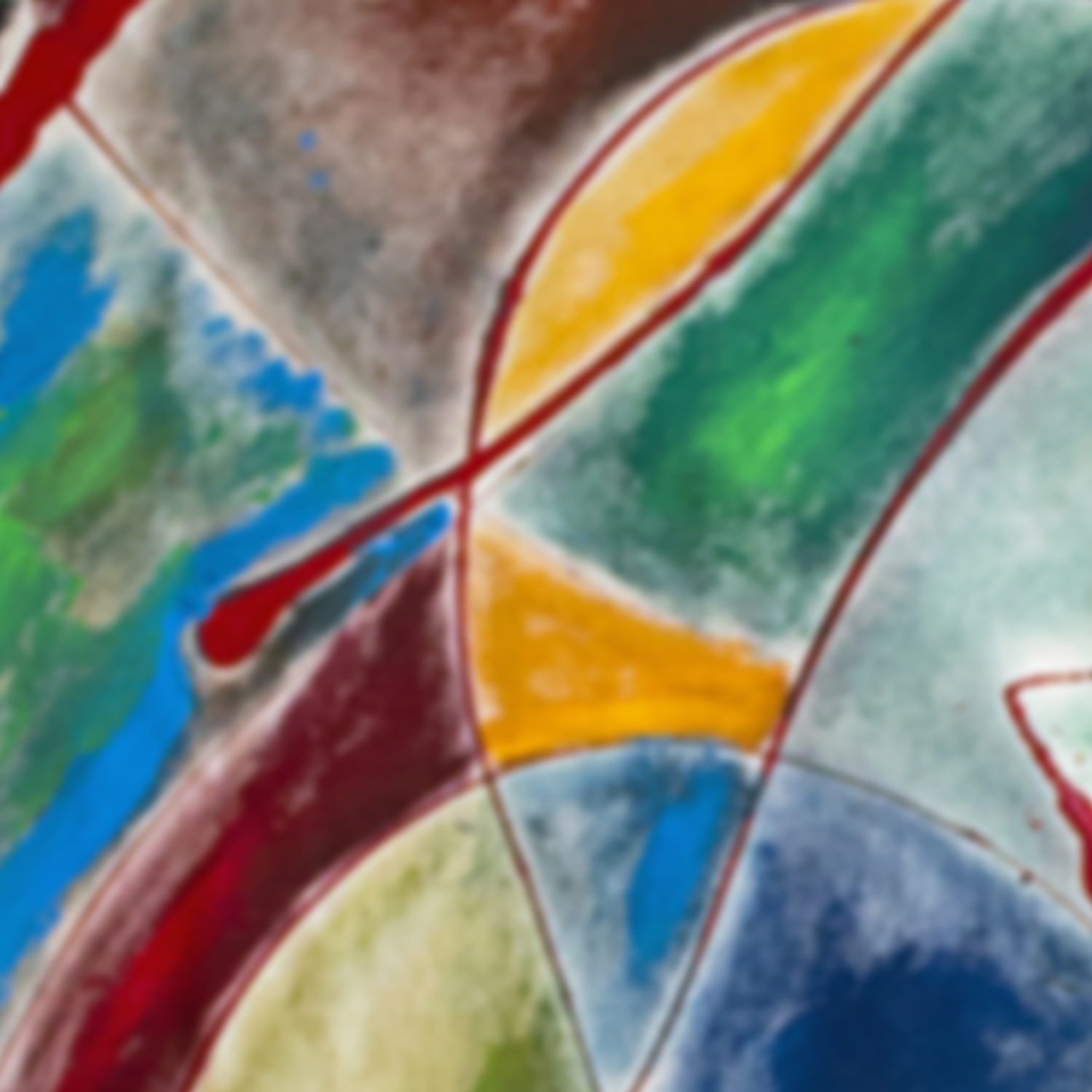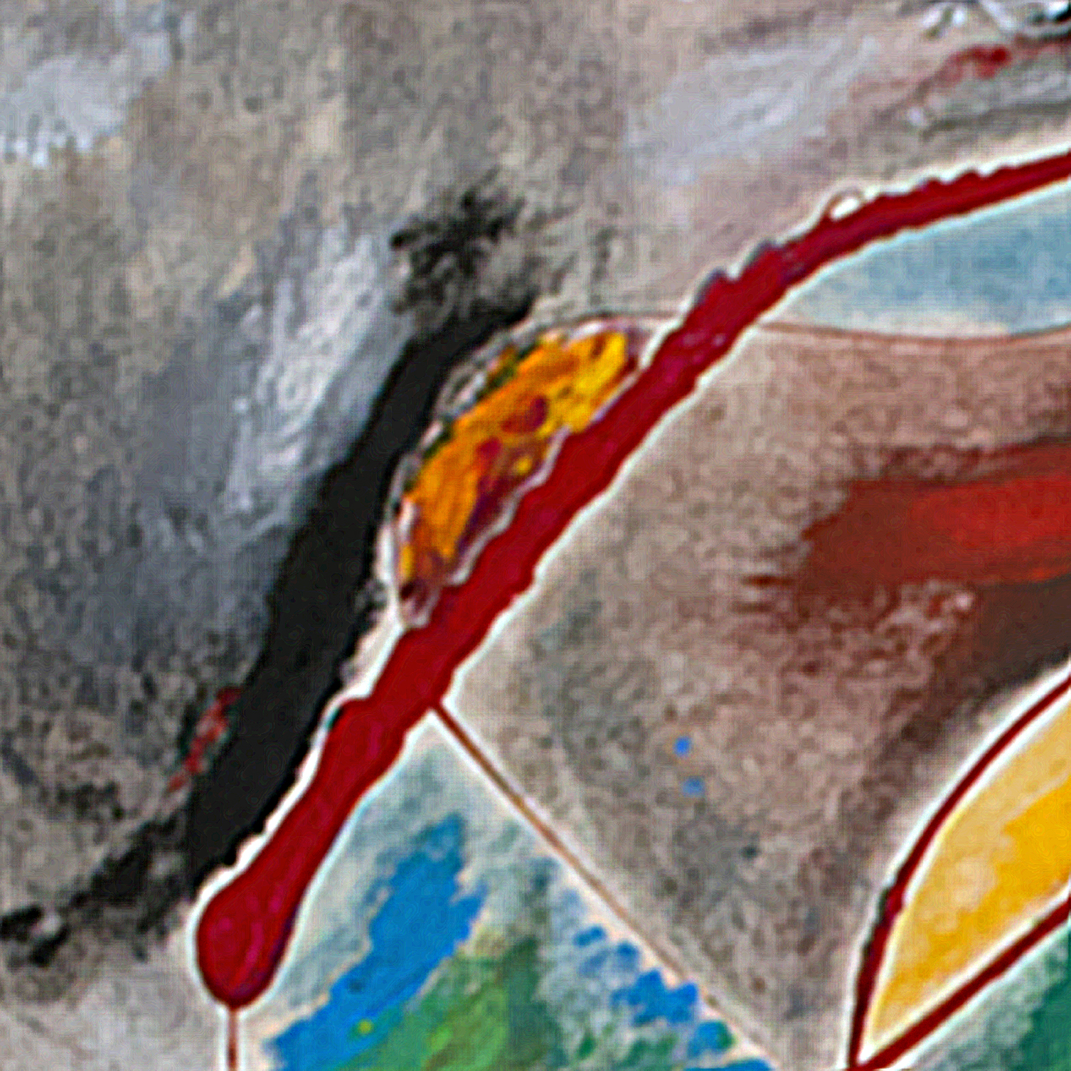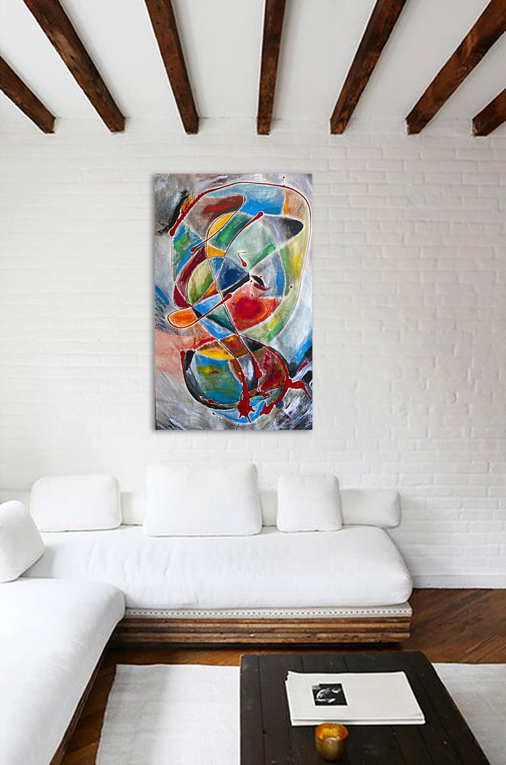 This painting unfolds through fluid, intersecting shapes organized by sweeping red lines that act like a rhythmic score. Translucent color fields—blues, greens, ochres, and reds—overlap and breathe within a soft, atmospheric ground. Influenced by music and movement, the process emphasizes balance and tension, allowing gesture and color to interact like harmonies in motion rather than fixed forms. Influenced by music and rhythmic composition, this work echoes a musical score. Ships in a tube.