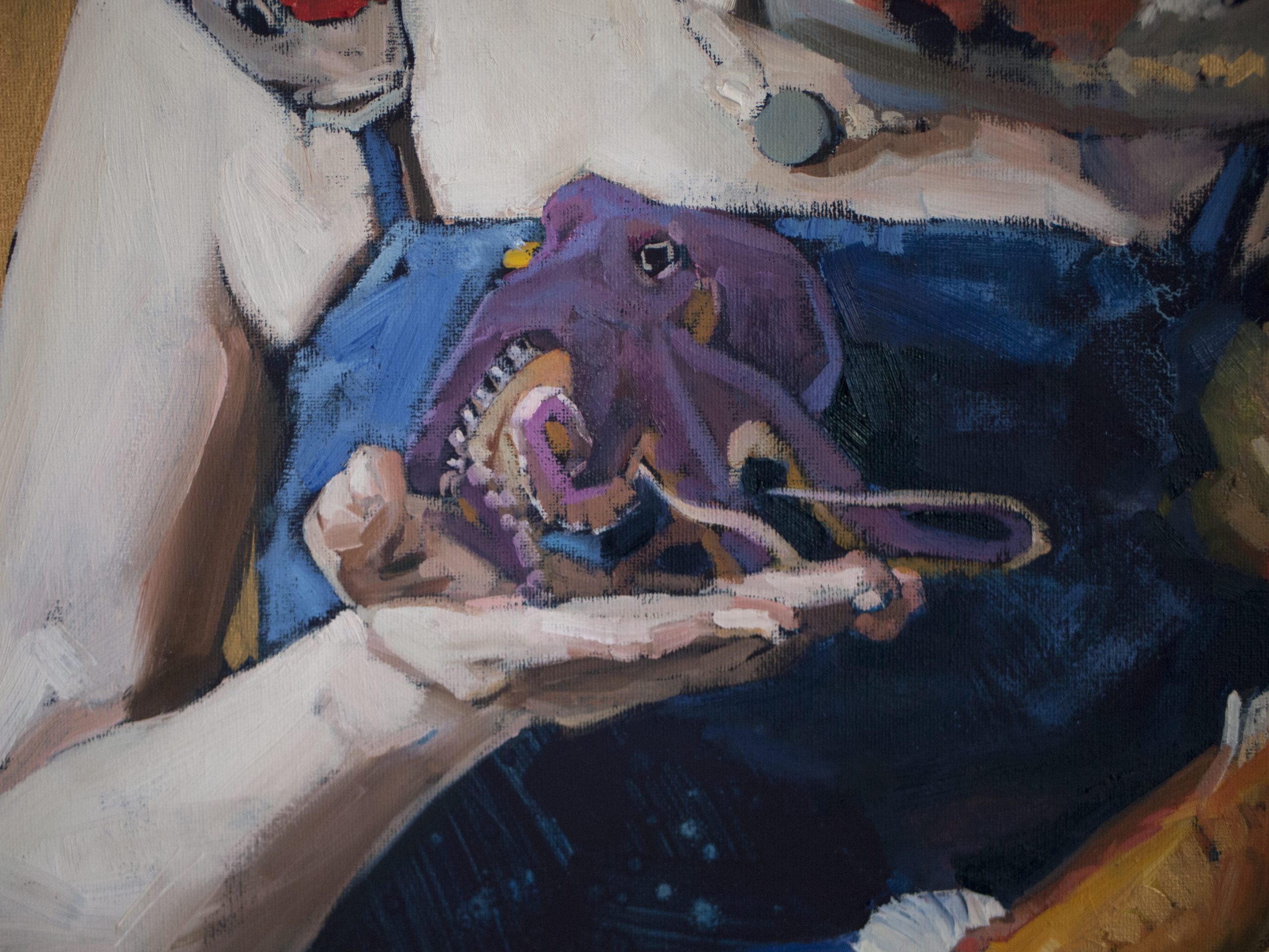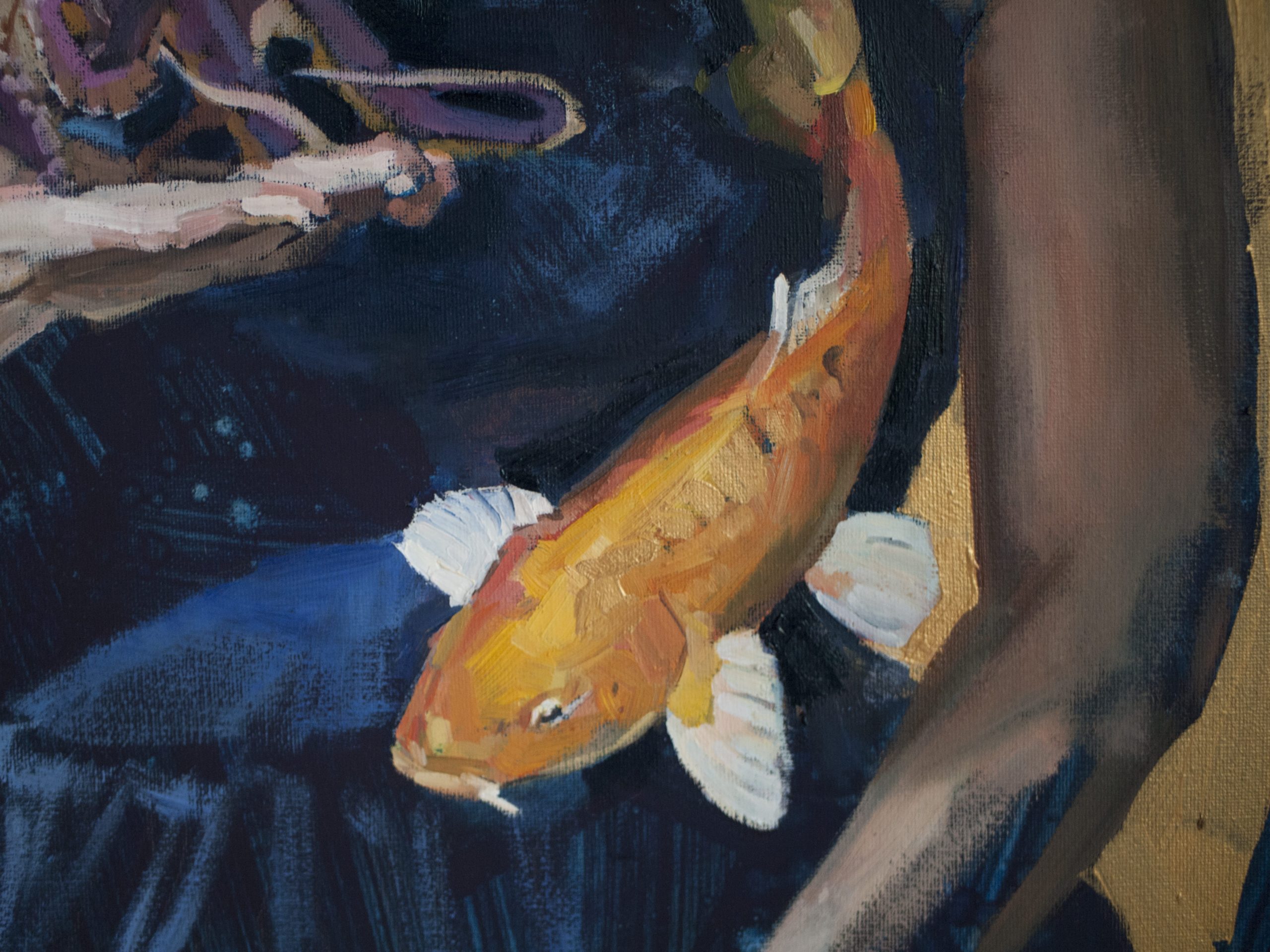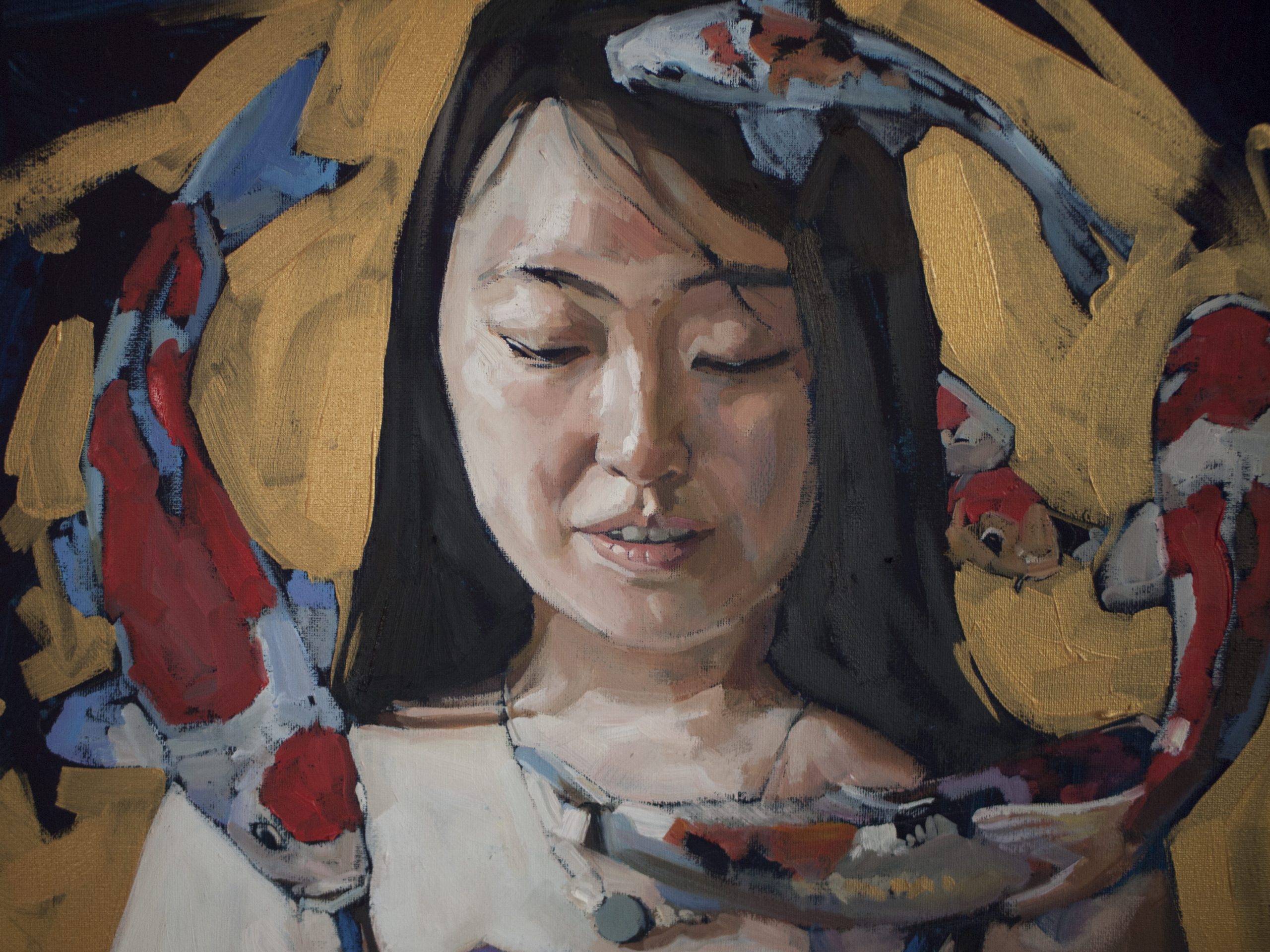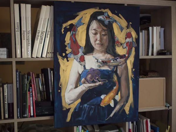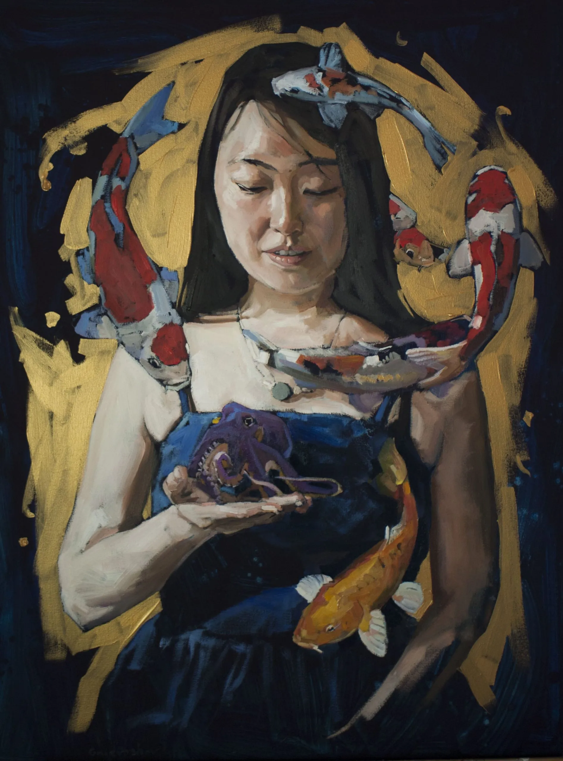 In this work I captured the fluidity of the subconscious using oil and acrylic. Surreal and symbolic, it slides between reality and dream. Delicate fish that dance gently around the central figure convey a mood of profound calm, symbolizing the connection between humans and nature. This painting exudes a captivating aura that will add a touch of mystery and emotional depth to any room.