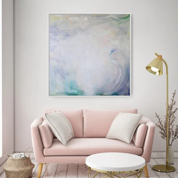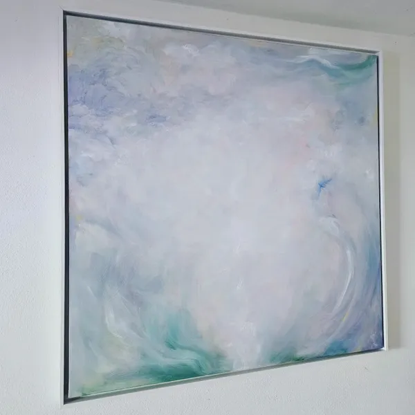 "The awakening" is a soft, subtle, large abstract painting, inspired by an ethereal primordial morning sky. A large, dramatic yet subtle emotion, difficult to photograph, so much more to see in person. A statement piece. A palette of cool greens, blues, rose, gold pigments and sparkling white.