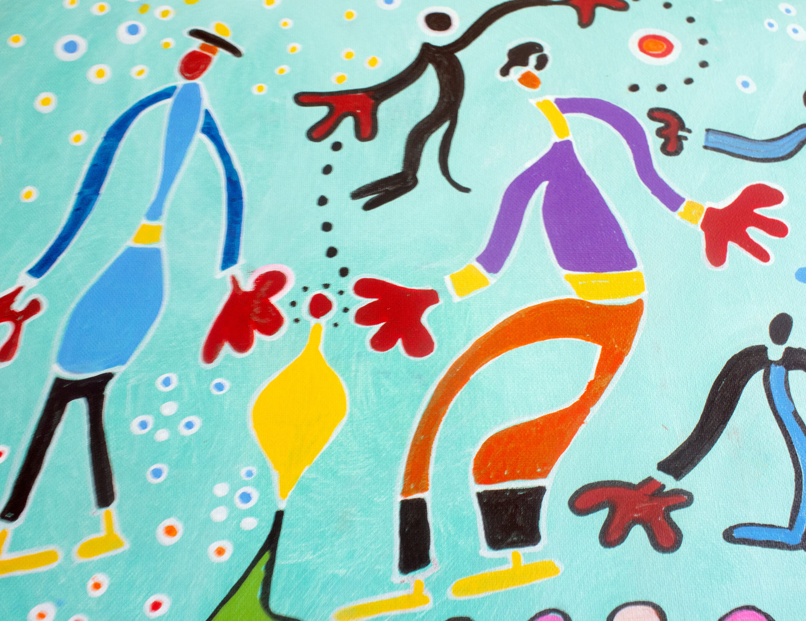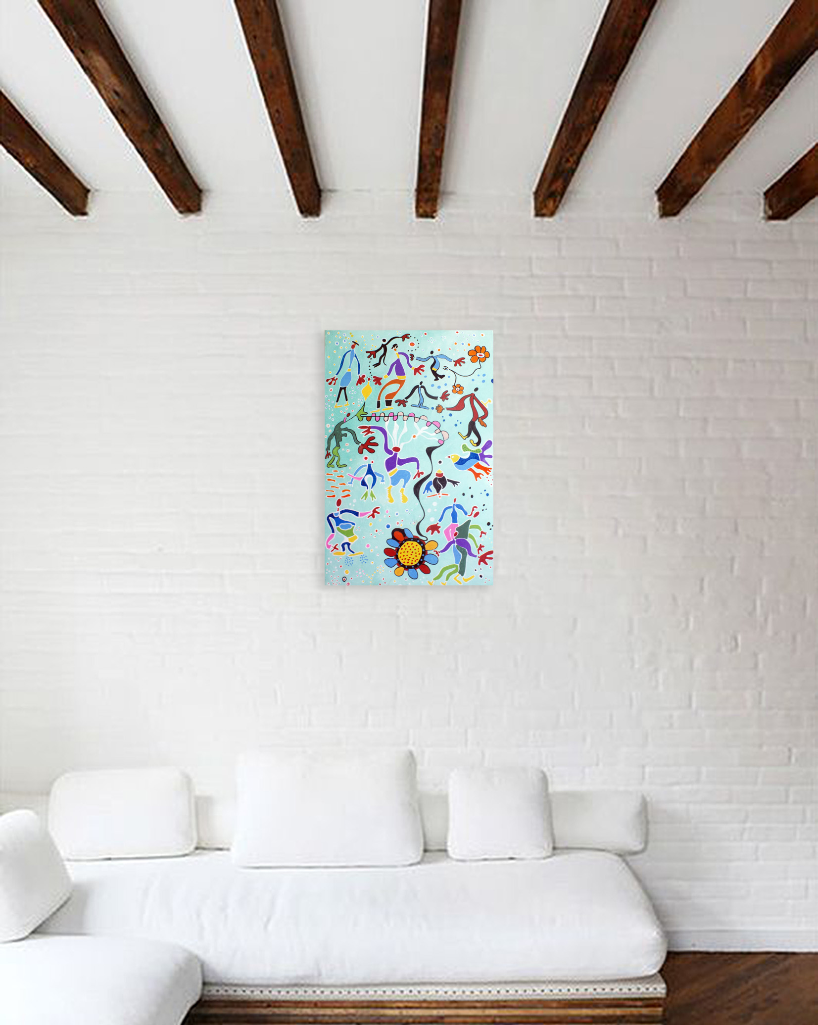 Set against a luminous turquoise field, this painting brings together wandering figures, birds, and floating floral forms in a playful journey of discovery. Created intuitively with oil markers and acrylics, the composition unfolds like an exploration—celebrating curiosity, movement, and the joy of stepping into the unknown.