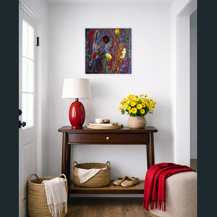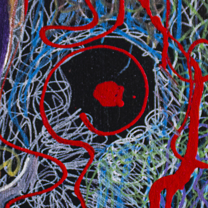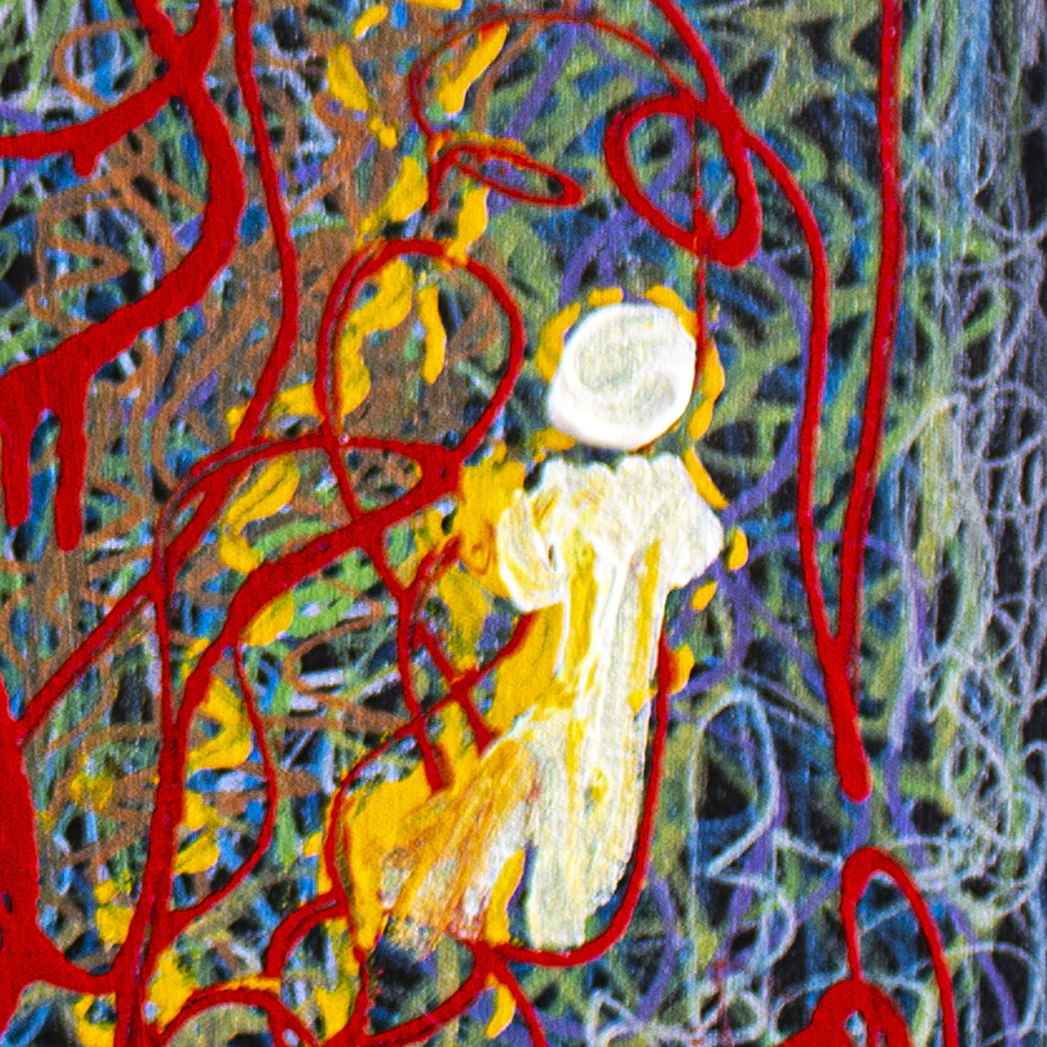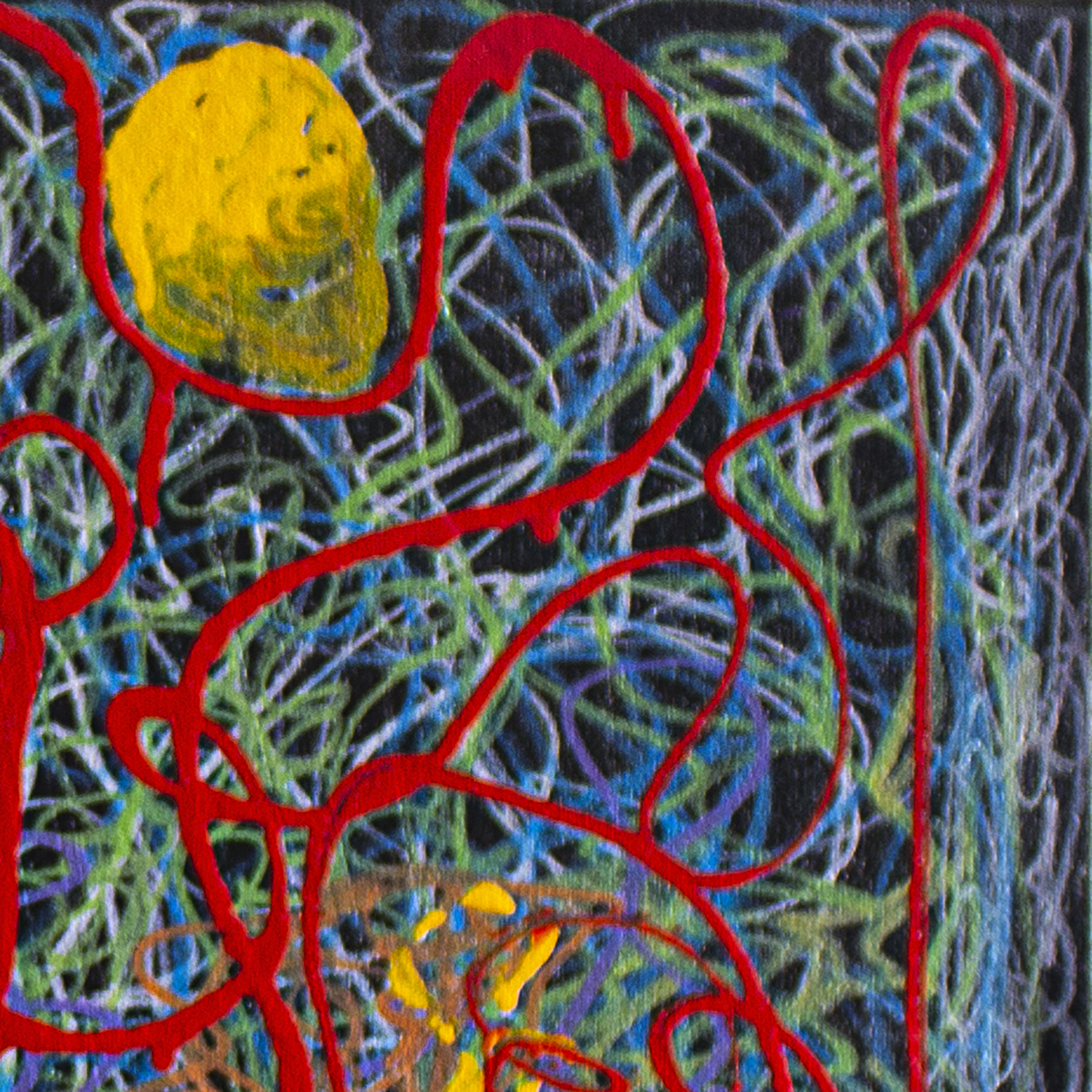 This painting is driven by forceful red gestures that cut and coil across a dense web of layered lines. The background builds through automatic scribbling in blues, greens, and greys, creating a charged, unstable field. Influenced by emotional rupture, inner conflict, and music-like rhythm, the process embraces tension and release. Drips, circles, and eruptions act as signals of resistance, allowing instinct, urgency, and raw movement to dominate over harmony or balance.