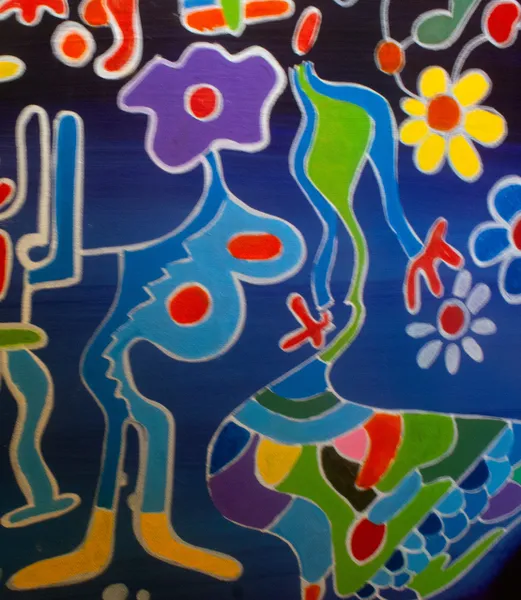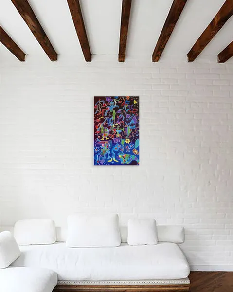 Against a deep, nocturnal background, The Sirène unfolds as a vibrant underwater procession. Hybrid figures drift, dance, and transform, guided by a siren-like presence at the base of the composition. Painted with oil markers and acrylics, the work blends myth, movement, and color into a dreamlike rhythm where bodies dissolve into song and current.