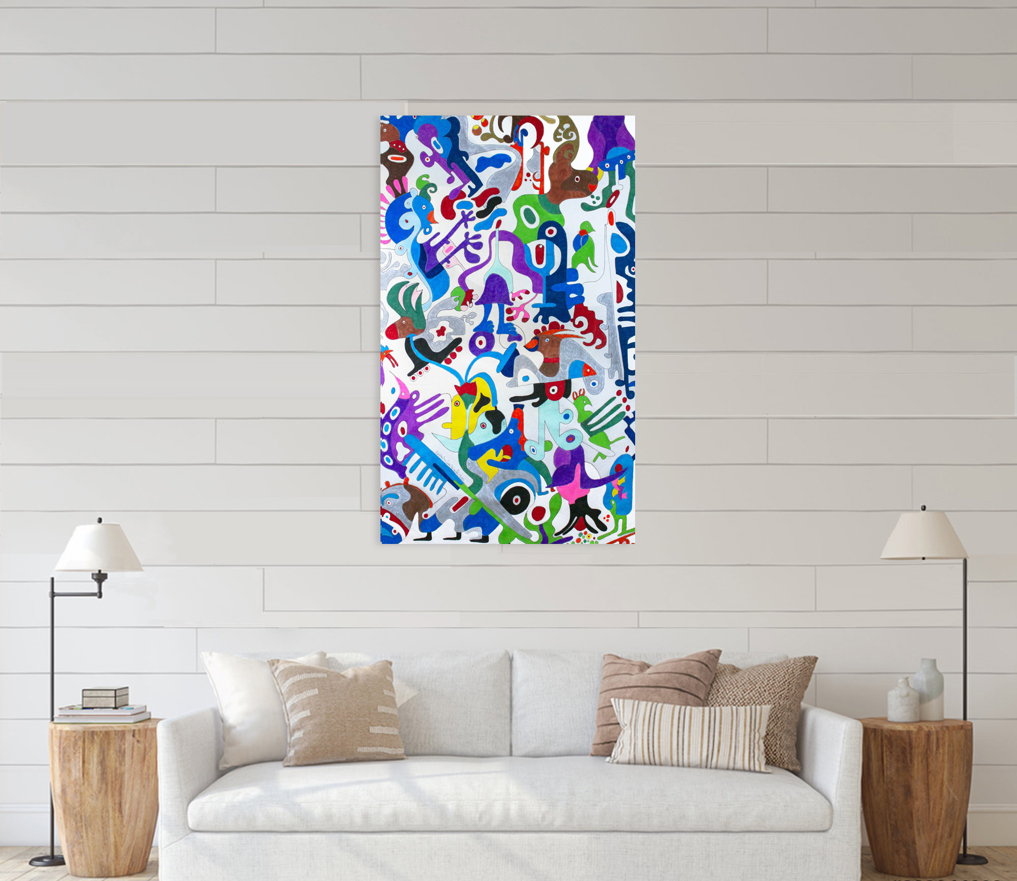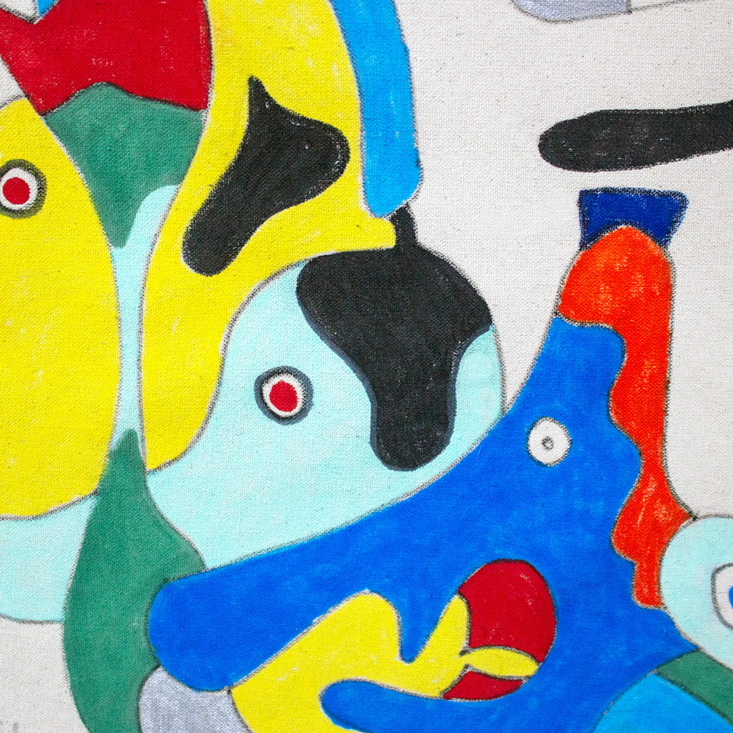 This composition is built through automatic, continuous drawing, where animated figures assemble into a lively narrative scene. Hybrid characters—part human, part animal—interact through gesture and movement, creating a playful yet structured visual rhythm. Influenced by Surrealist automatism, Miró’s biomorphic vocabulary, and graphic storytelling, bold color fields and patterned details guide the eye across the surface, evoking humor, vitality, and the theatrical energy of an imagined collectiv