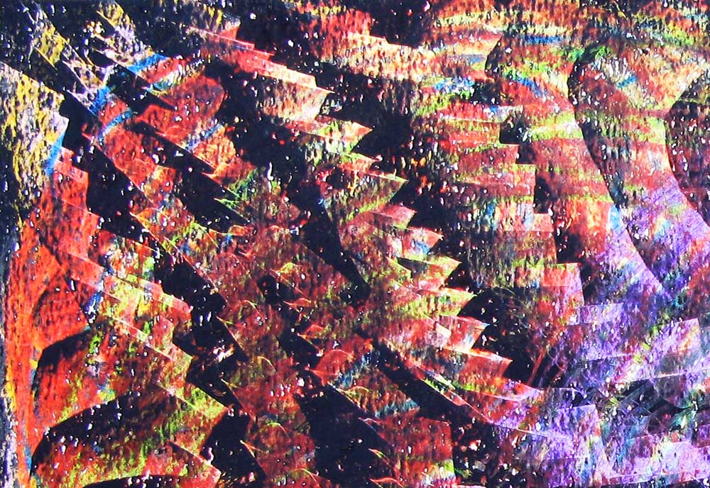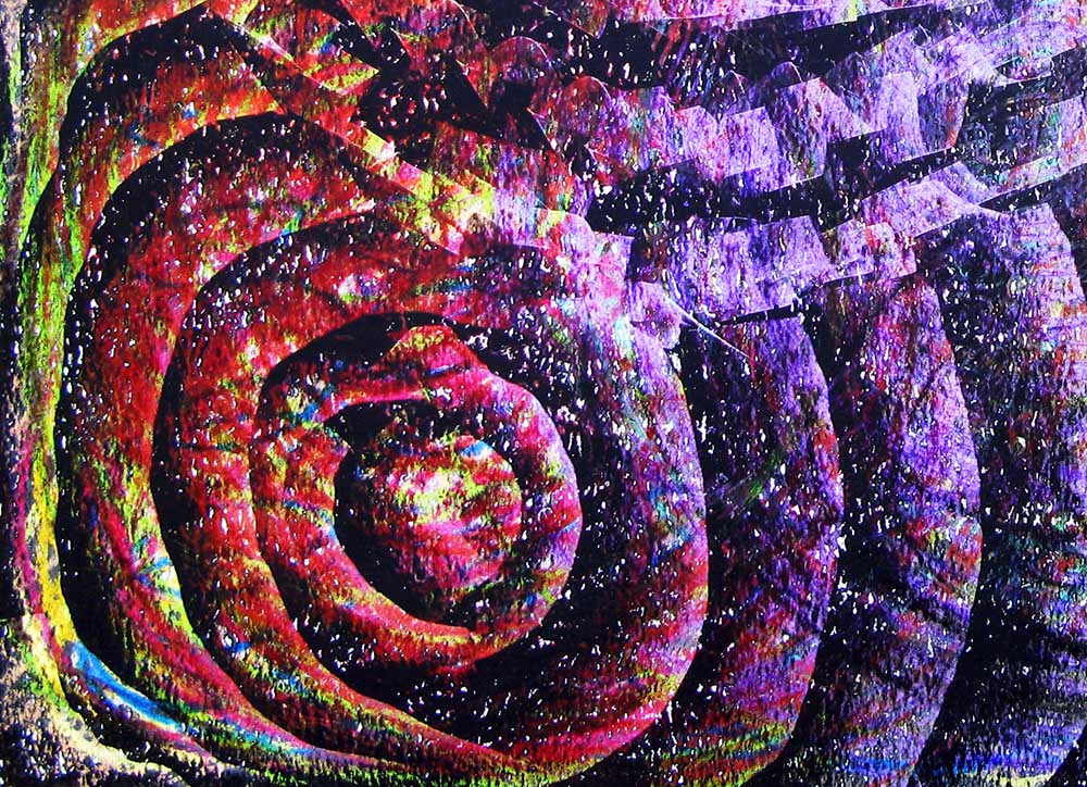 A work characterized by spiral patterns and concentric circles that immerse the viewer in their depths. The technique is created through layers, imbuing the surface with a sense of depth and complexity that intrigues and captivates. Each shift and transition of color adds a vibrant rhythm, reminiscent of sound waves or ripples in water, inviting interpretation. The juxtaposition of light and dark tones enhances the illusion of three-dimensionality, creating a vivid sensory experience.