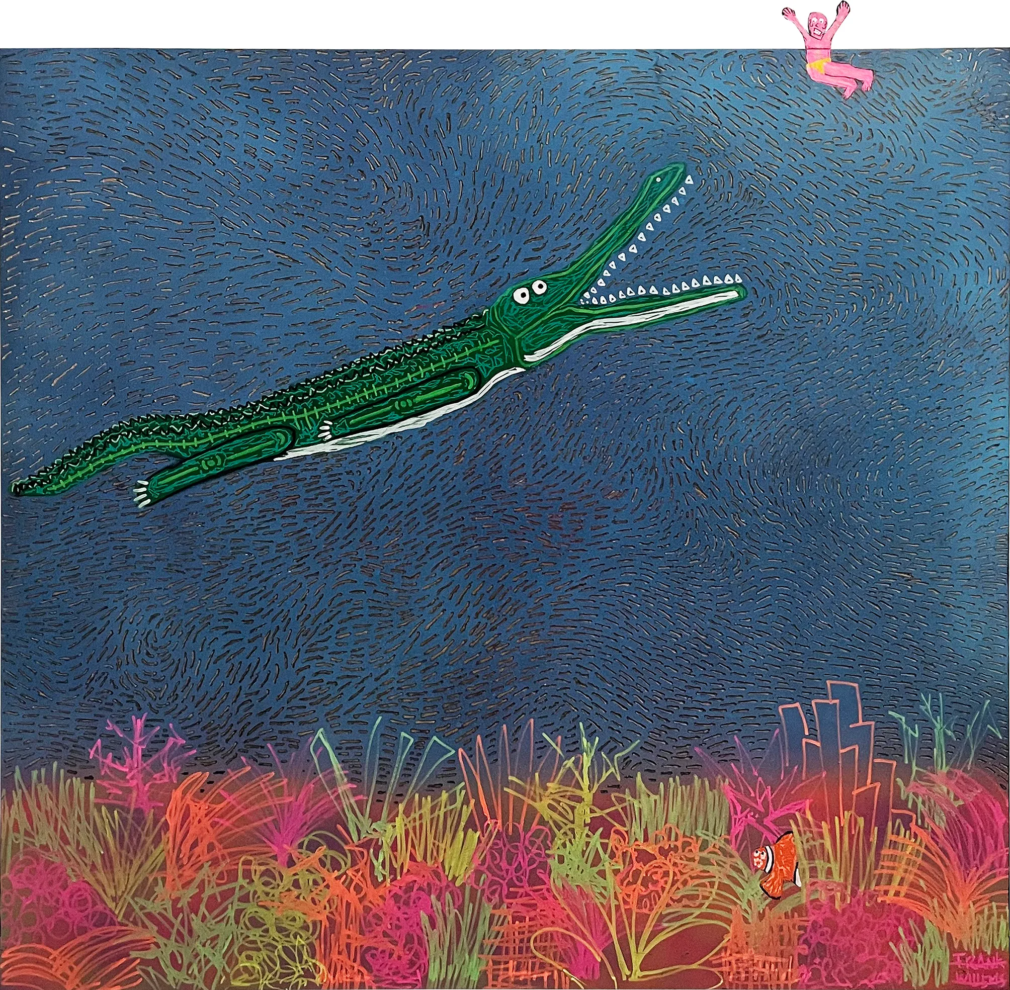 Discarded materials, especially reclaimed wood, form the foundation of his work. Not only for sustainability reasons but also for their raw, lived-in appearance, which adds depth to his compositions. He embraces the imperfections of the material and incorporates them into his expressive visual language, where cartoonish figures, skeletal forms, and animals frequently appear. His work is playful and colorful, yet beneath the cheerful exterior often lies a deeper, sometimes confrontational layer.
