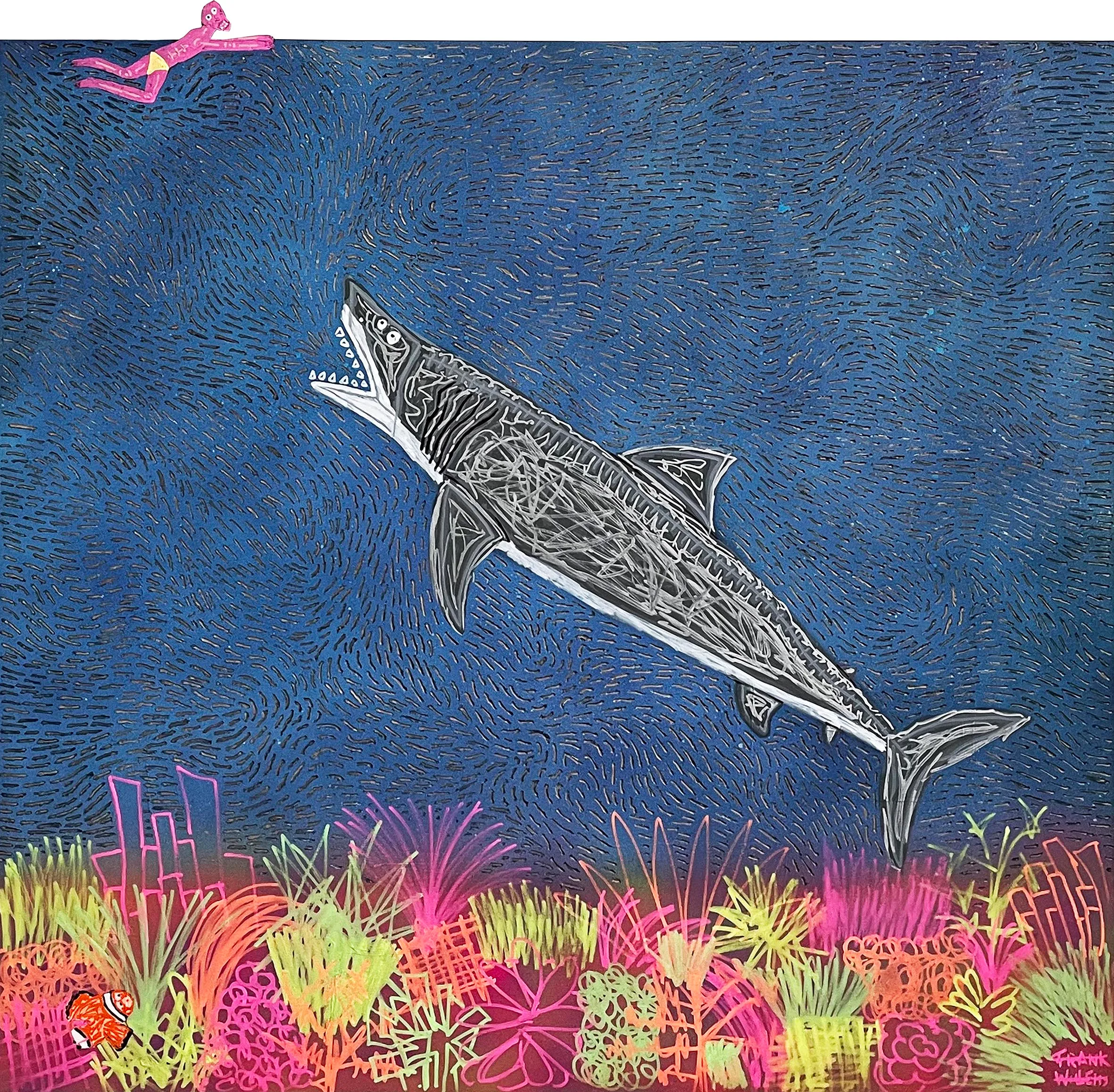 Discarded materials, especially reclaimed wood, form the foundation of his work. Not only for sustainability reasons but also for their raw, lived-in appearance, which adds depth to his compositions. He embraces the imperfections of the material and incorporates them into his expressive visual language, where cartoonish figures, skeletal forms, and animals frequently appear. His work is playful and colorful, yet beneath the cheerful exterior often lies a deeper, sometimes confrontational layer.