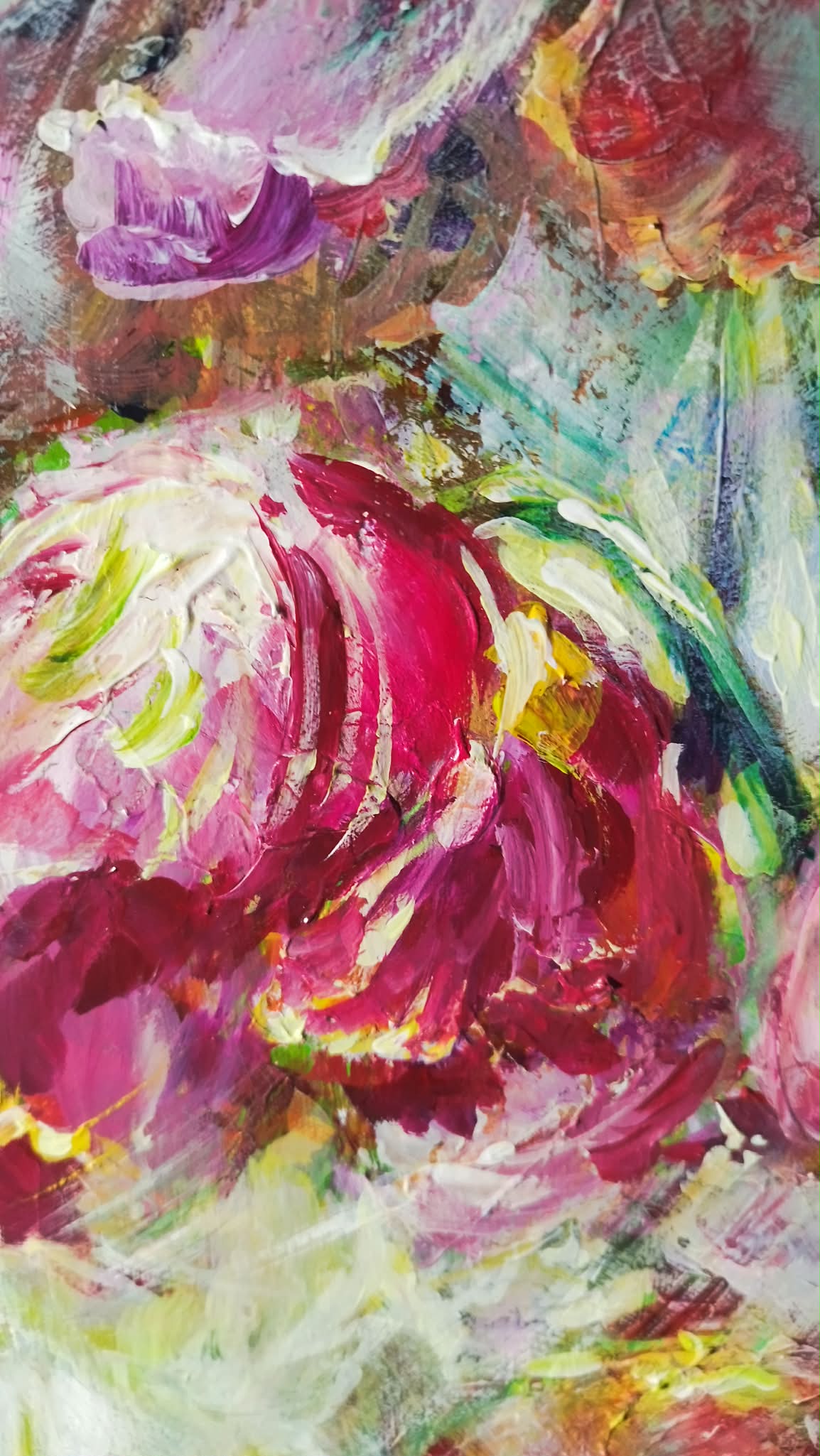 Red, pink, violet and gold tones sweep across the surface, giving the flowers both structure and movement.