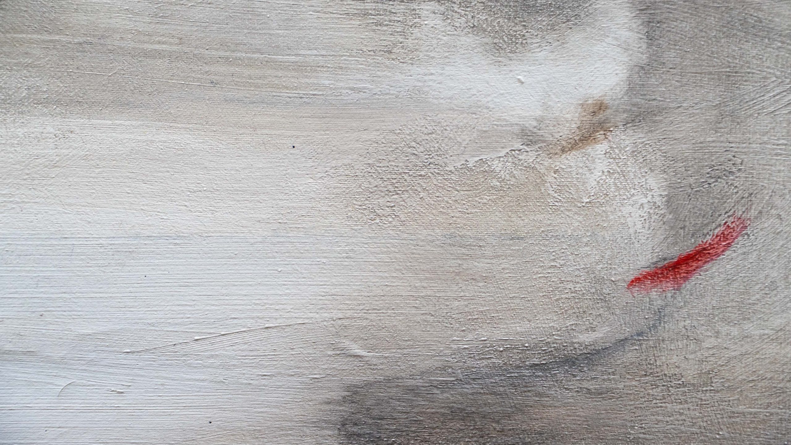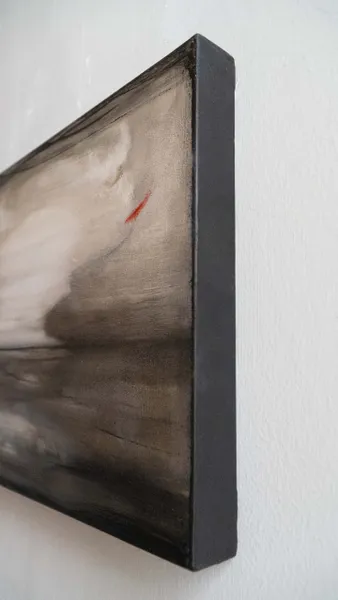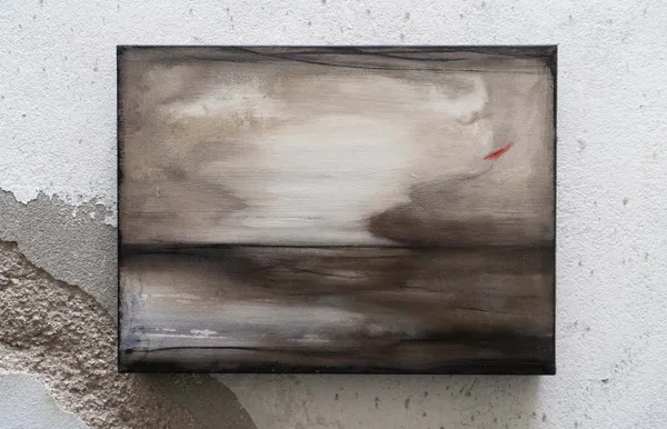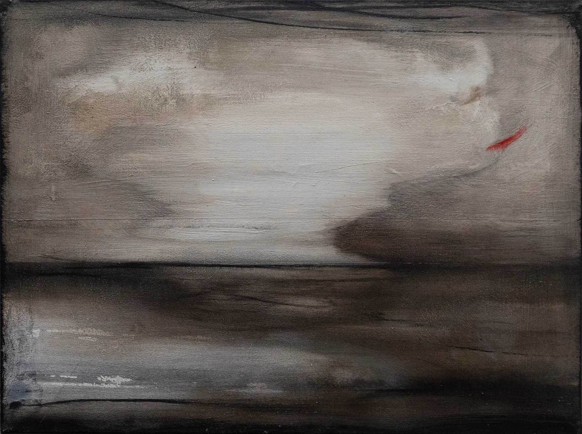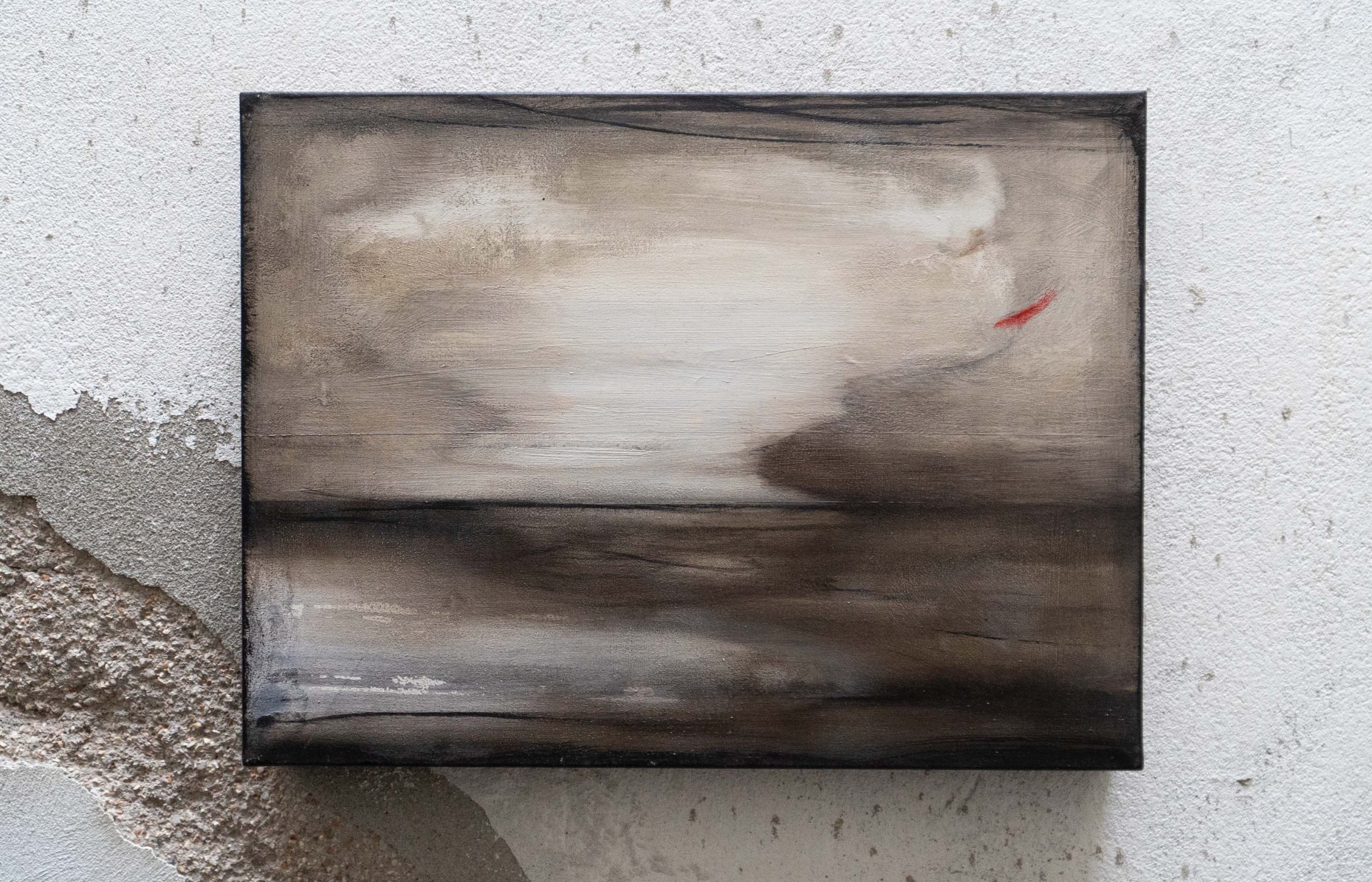 In questo dipinto un turbine si materializza lungo la linea di orizzonte. Un gioco visionario. Tra i colori impastati e polverosi emerge una insolita traccia rossa.
