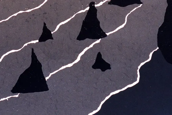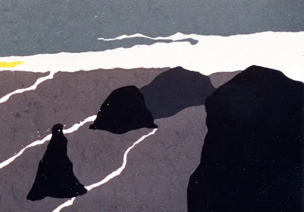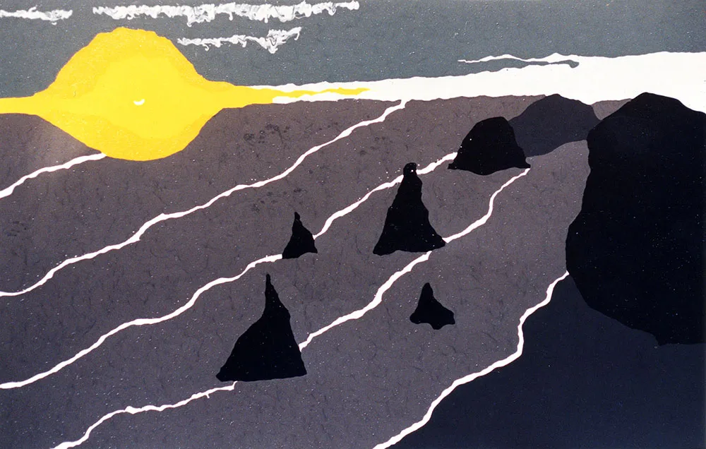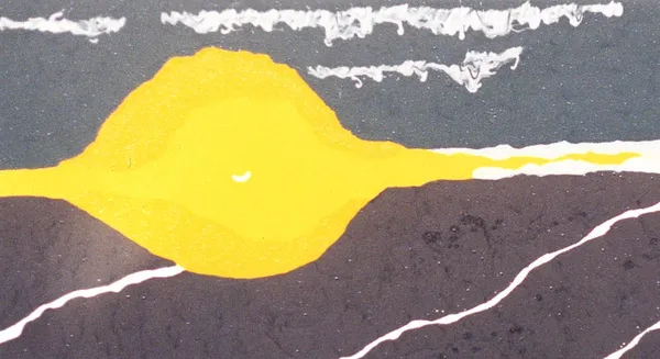 A deep yellow sun, dominates the scene and projects a dynamic play of light and shadow across the composition. Jagged black stones protrude from the rolling gray waves. Delicate white lines trace the waves, bringing movement and rhythm to the piece. The sky, a mix of grays and whites, complements the dramatic atmosphere of the scene.