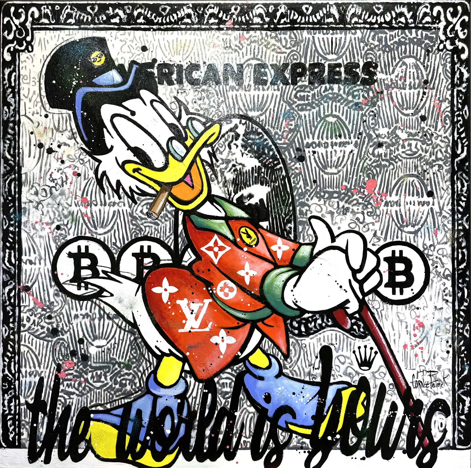 A pop art and street art vision of Scrooge Unique and original work signed by the painter Patrick Cornée, delivered with invoice and certificate of authenticity. The canvas is varnished for better protection of the work and is ready to be hung on the wall. I enjoy using and experimenting with all the techniques on canvas, oil, acrylic, knives, brushes, engraving, spray cans, collage, gold leaf, micro-glitter inlay… from small to very large formats.
