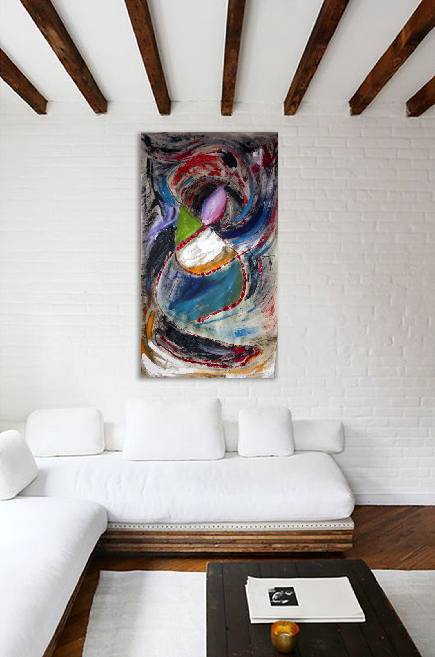 This painting explores an inner passage marked by tension and release. A central geometric form anchors swirling gestures, suggesting a turning point or emergence. Influenced by abstract expressionism and emotional automatism, the work was built through layered acrylic and oil strokes, scraping and reworking the surface to reveal movement and depth. The canvas is unstretched, preserving the raw, physical energy of the process and will ship in a tube.