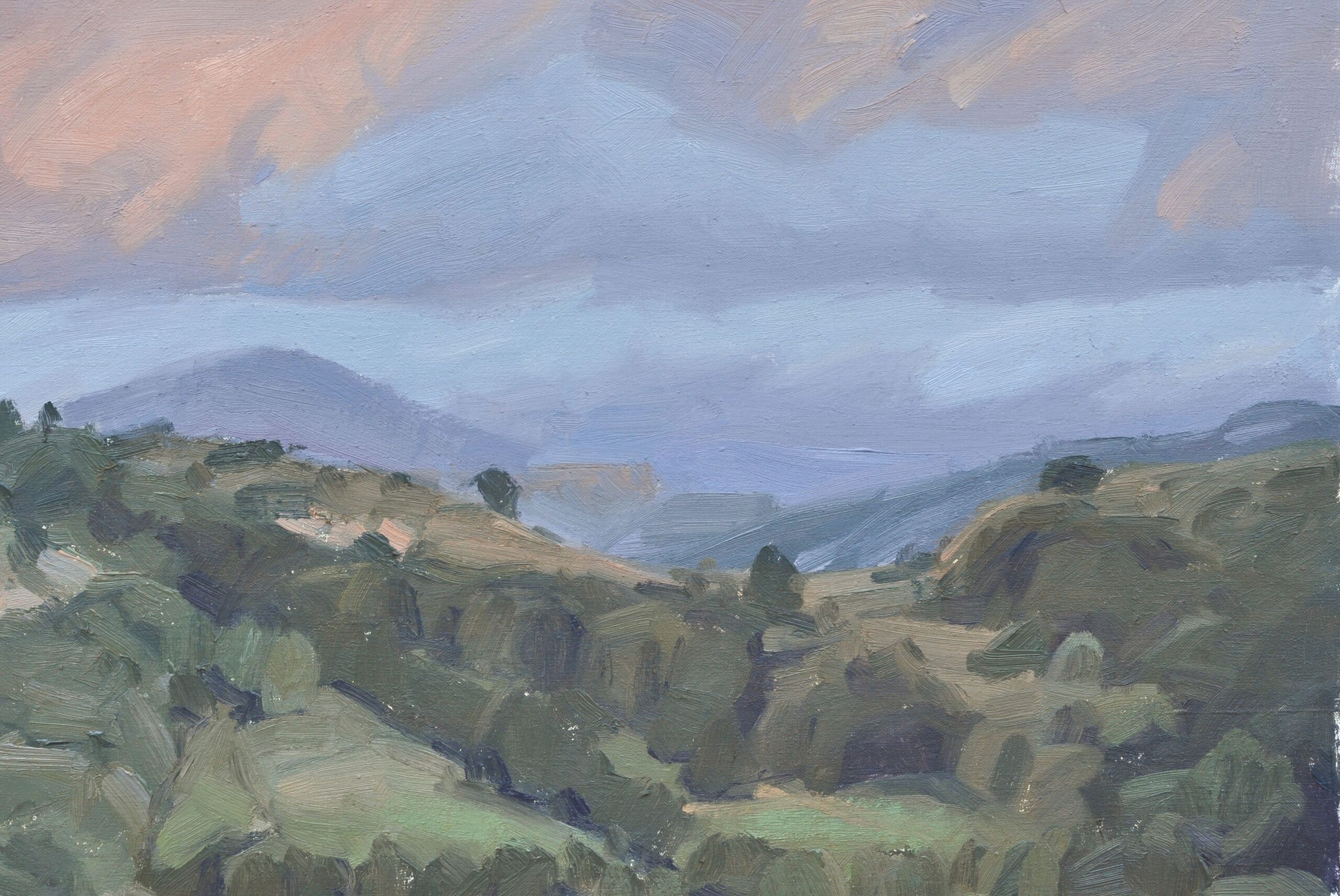 Landscape of Auvergne, France. View from my studio. This landscape is painted “alla prima”, with lively and spontaneous brushstrokes to attempt to capture the momentary effects of sunlight , the movement and the atmosphere. Shipping method: - Europe & USA: Shipped stretched and ready to hang. - Rest of World: Shipped safely rolled in a sturdy tube.