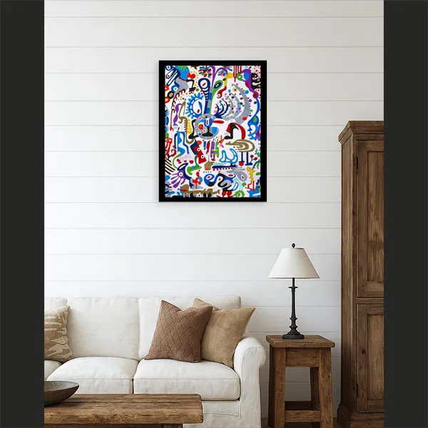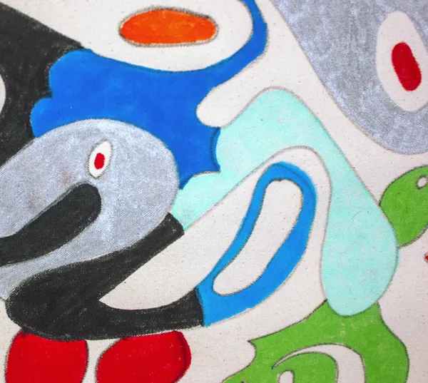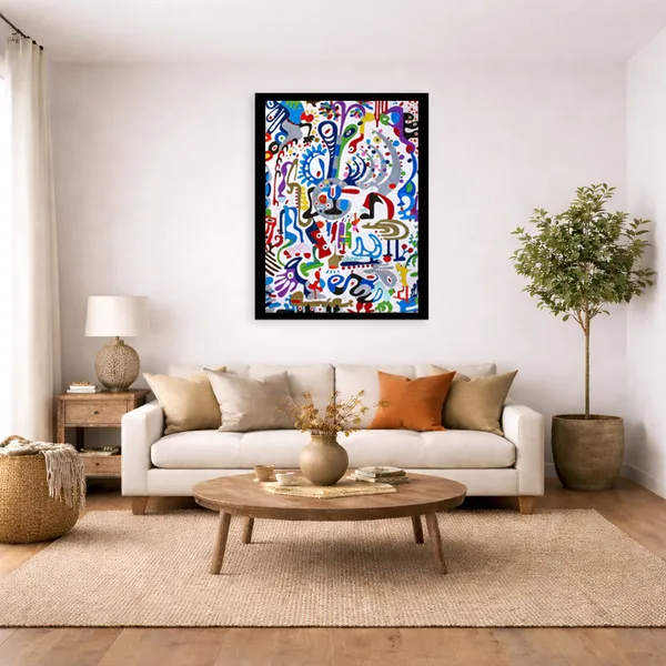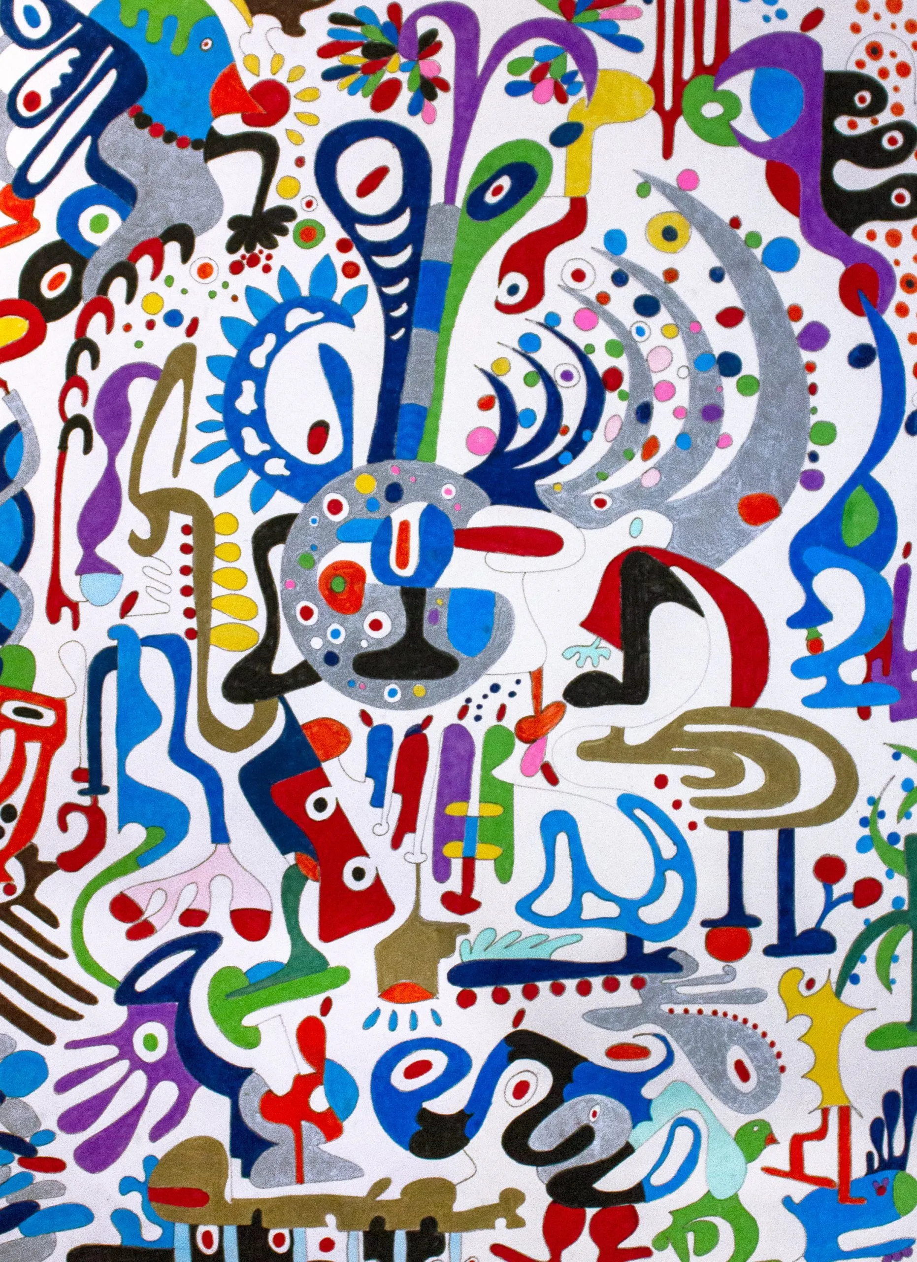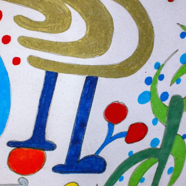 This work unfolds through intuitive, automatic drawing, forming a dense, swirling bouquet of biomorphic shapes and symbolic gestures. A central circular motif anchors the composition, while radiating lines and dotted patterns suggest growth, sound, and organic expansion. Influenced by Surrealist automatism, Miró’s playful abstraction, and decorative folk rhythms, vivid colors and metallic accents create a sense of movement and celebratory energy, evoking abundance, imagination, and the pulse of