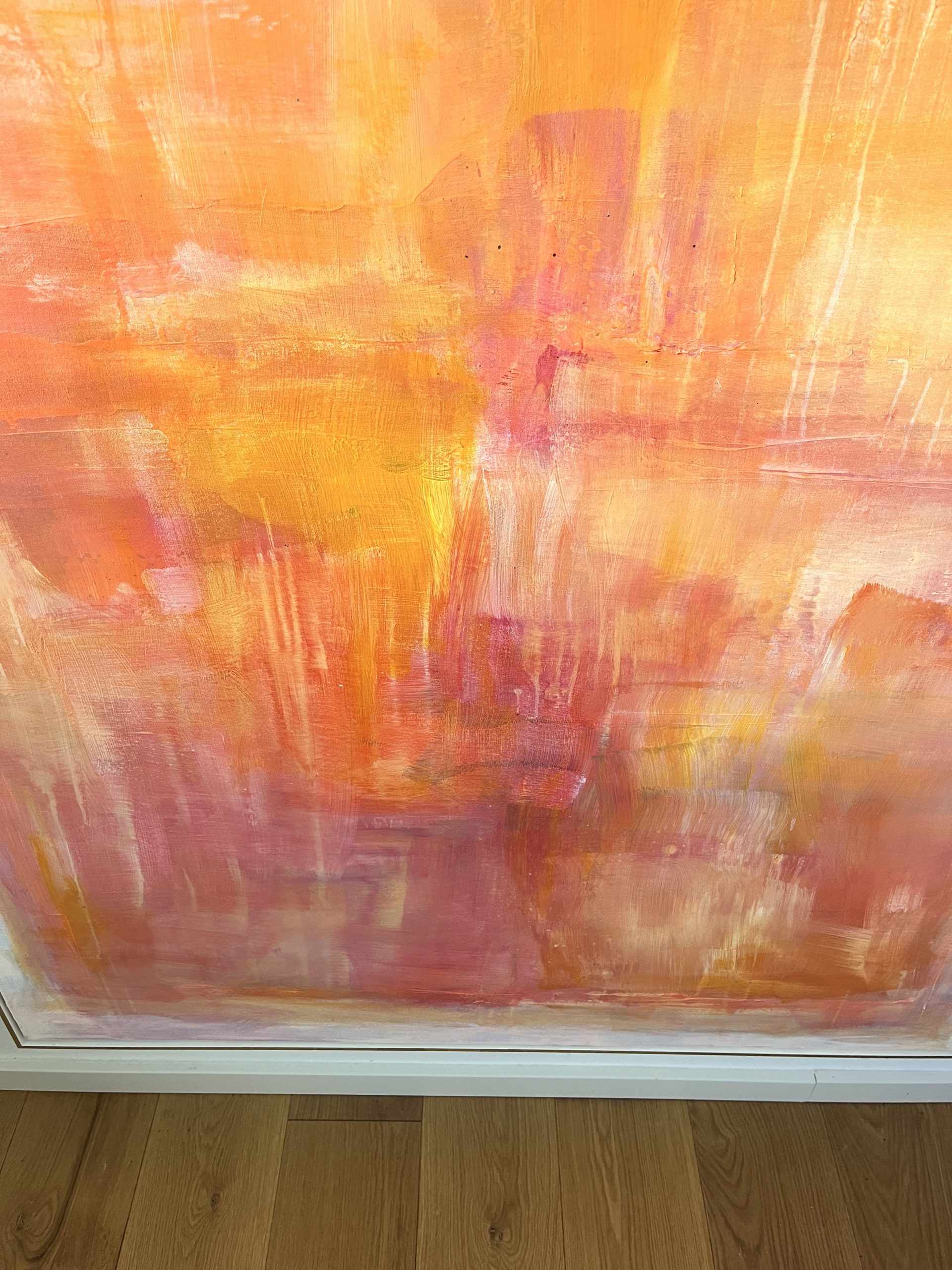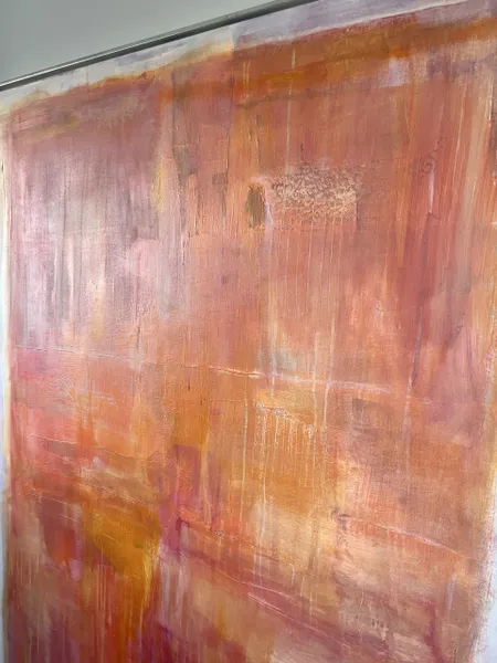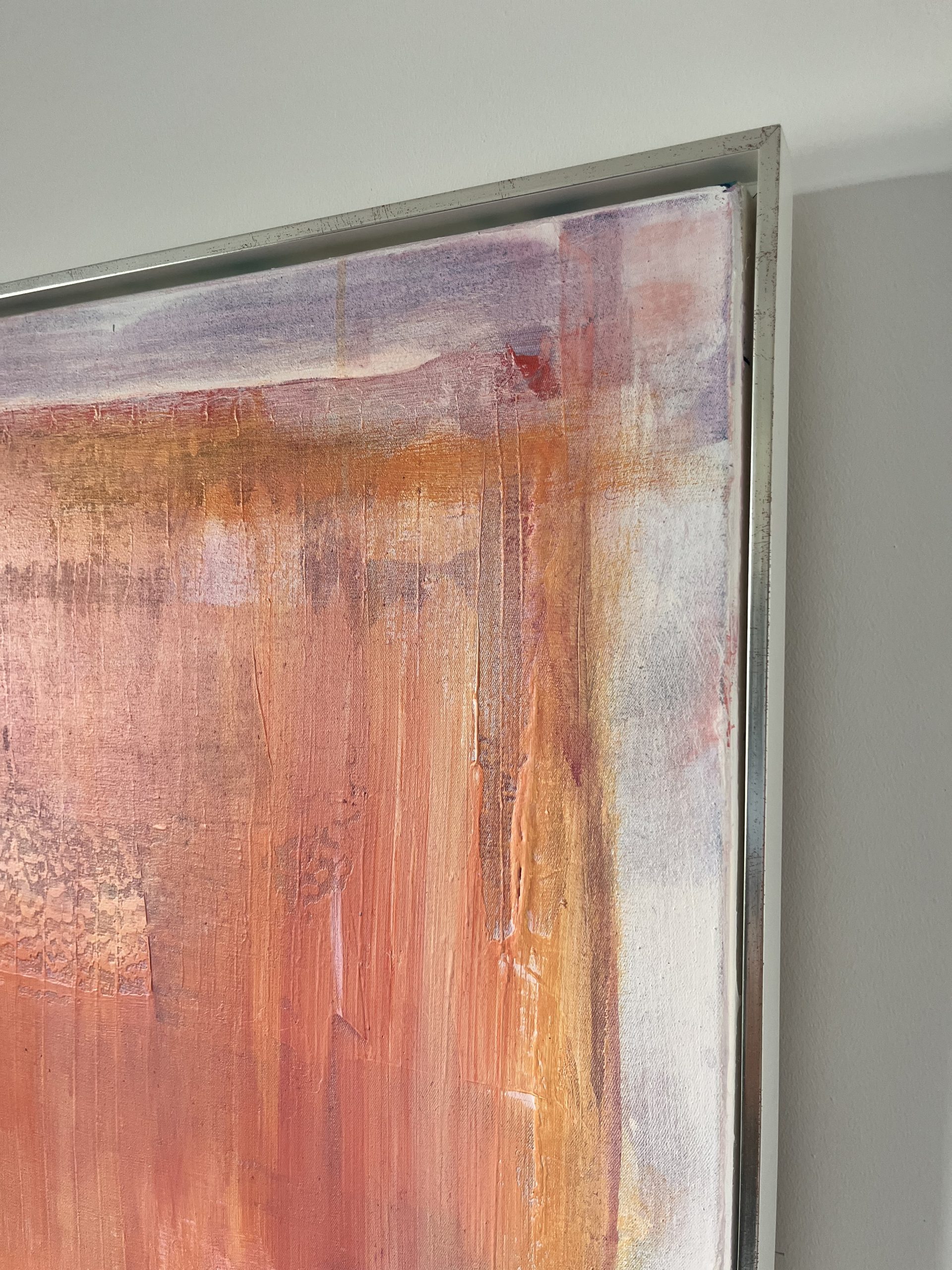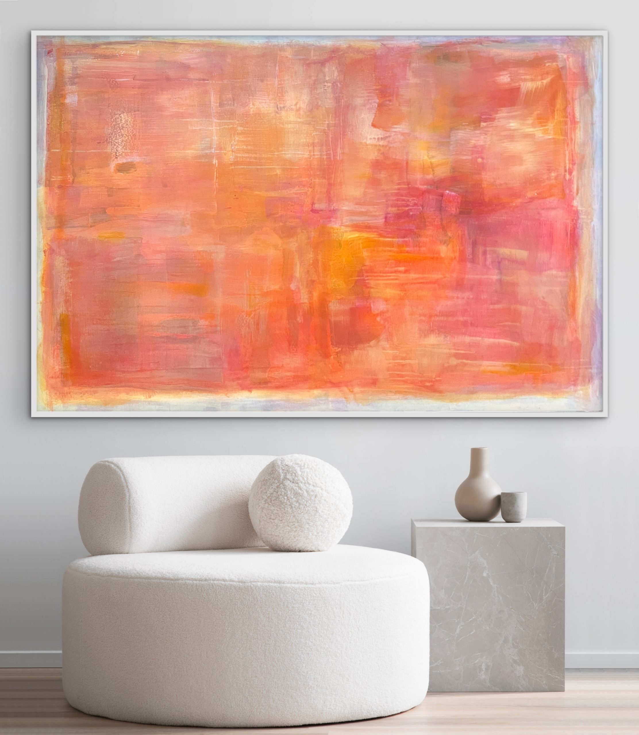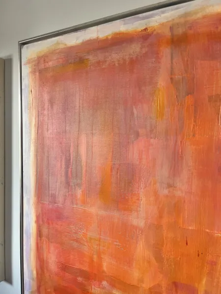This work from the Within Frame series intensifies the tension between limitation and inner movement through a warm, layered composition of coral, orange, and rose tones. Layered surfaces and flowing transitions create depth and light, resulting in a calm yet vibrant presence. Concentrated zones meet more open areas, forming a subtle interplay between focus and openness. Within the clear frame, color unfolds as space — at times still and contained, at times soft in motion. A contemporary stateme