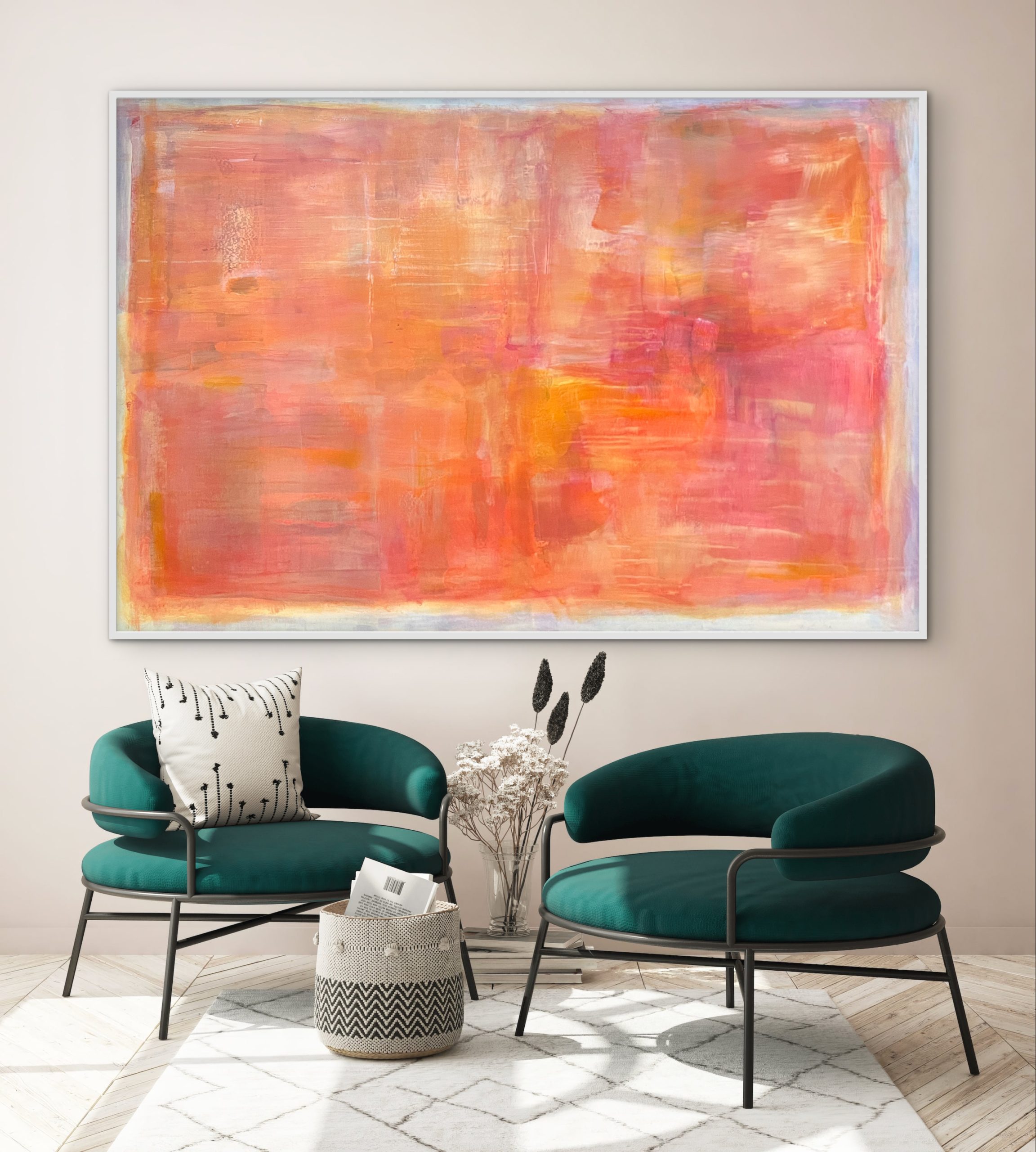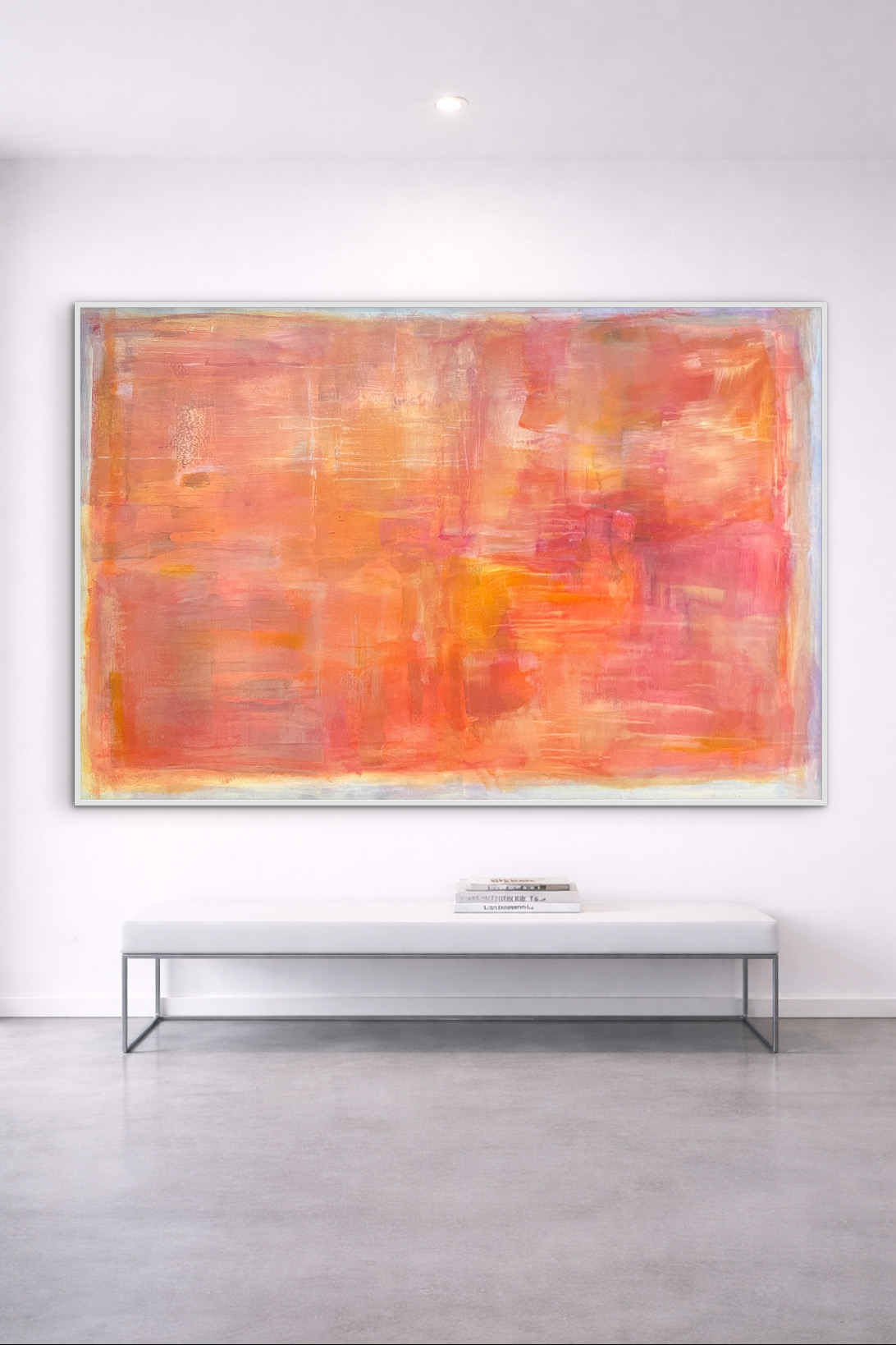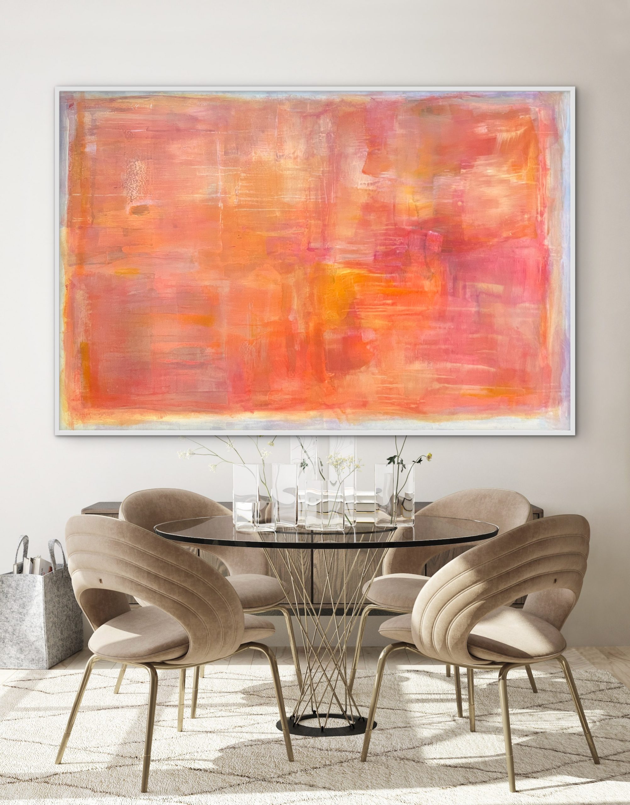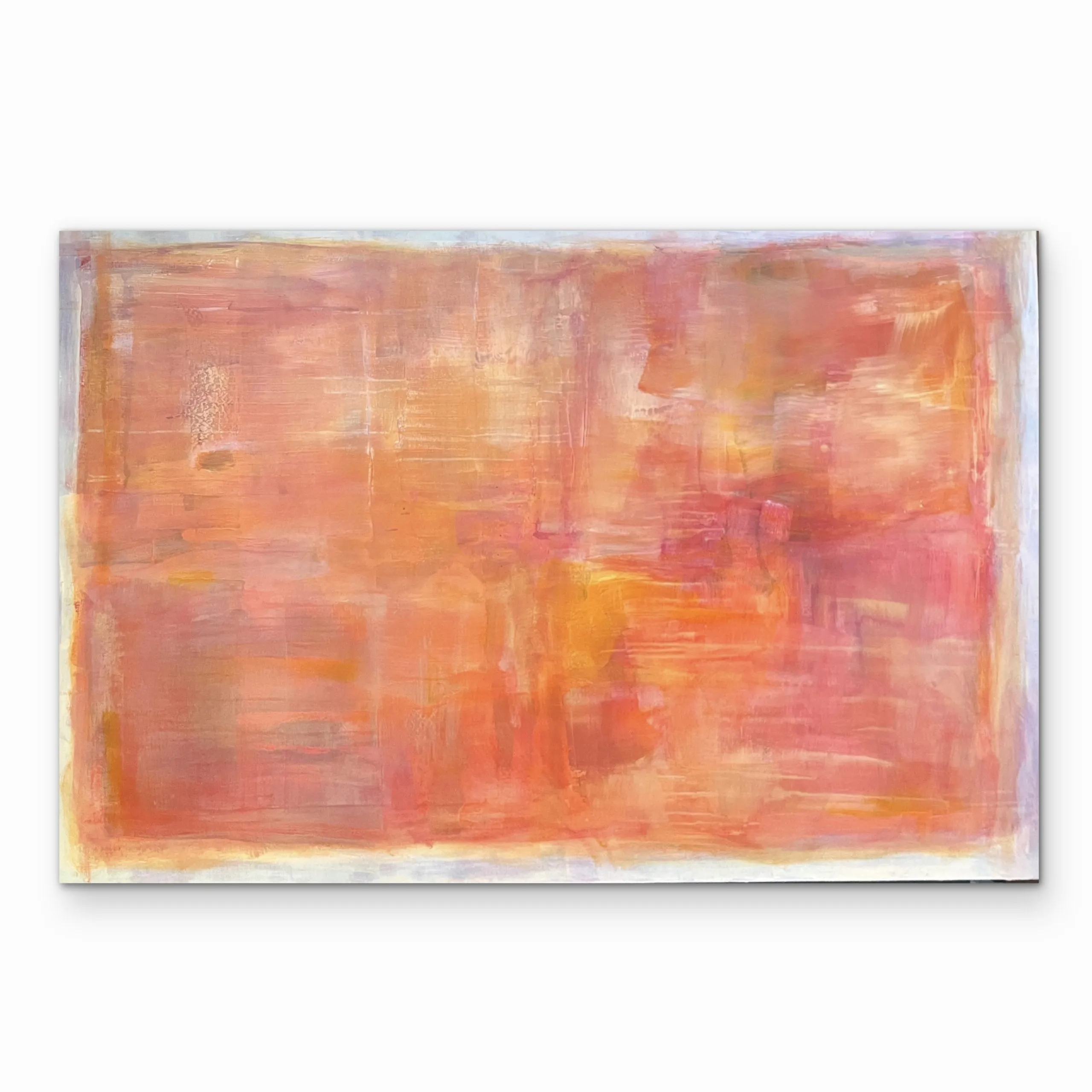 This work from the Within Frame series intensifies the tension between limitation and inner movement through a warm, layered composition of coral, orange, and rose tones. Layered surfaces and flowing transitions create depth and light, resulting in a calm yet vibrant presence. Concentrated zones meet more open areas, forming a subtle interplay between focus and openness. Within the clear frame, color unfolds as space — at times still and contained, at times soft in motion. A contemporary stateme