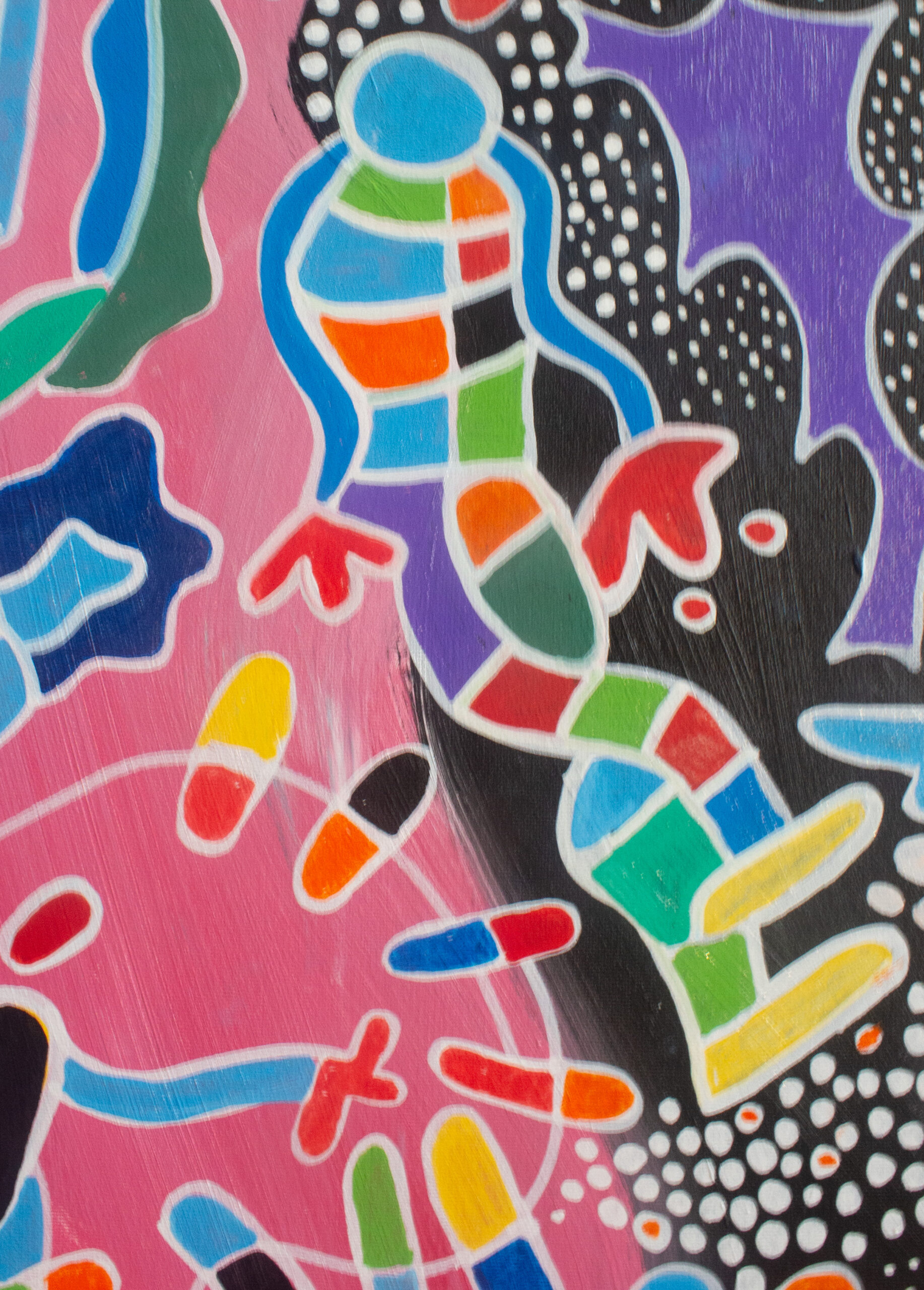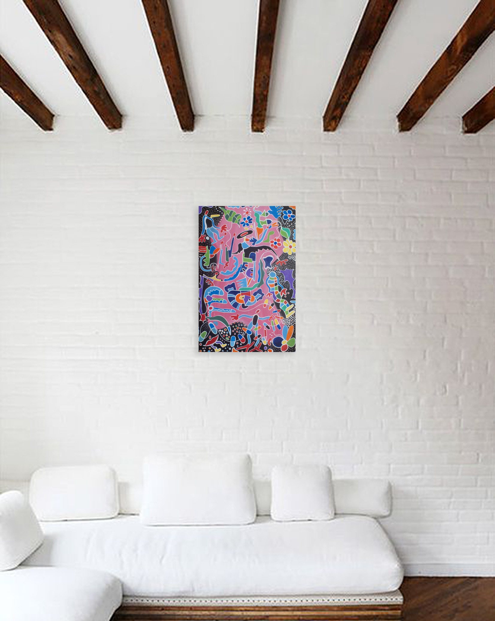 Set against a vibrant pink field punctuated by deep black shapes, Woman in Black centers on a powerful, elongated figure that anchors a swirl of playful, fragmented forms. Painted with oil markers and acrylics, the composition explores contrast and balance—strength and vulnerability—through rhythmic lines, bold color, and a sense of suspended motion.