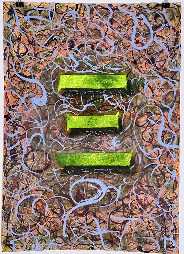 Xi est un des dessins de technique mixte, (aquarelle, encre, acrylique), des dix lettres en capitales de l'alphabet grec qui se différencient par leur architecture de l'alphabet romain.